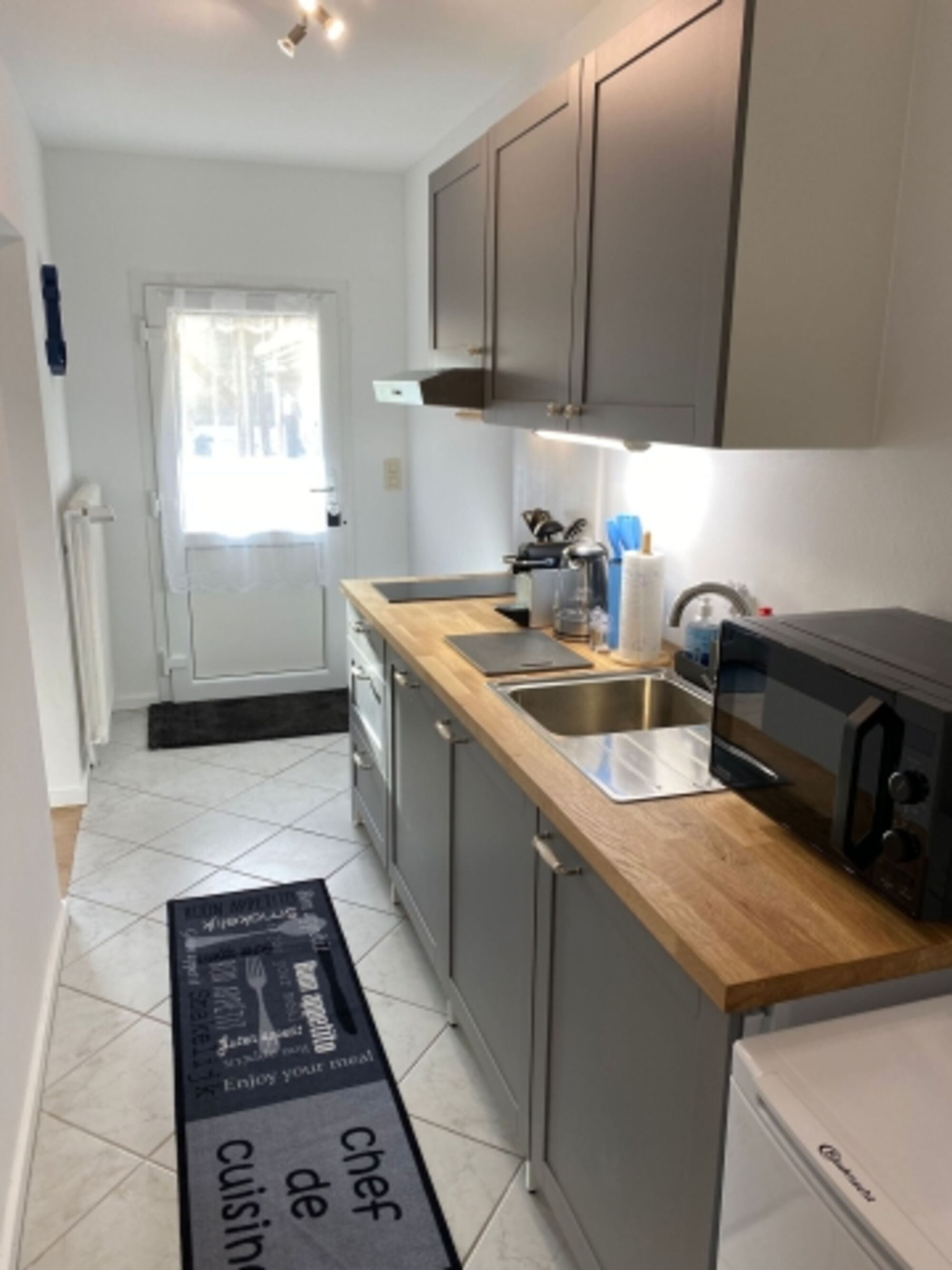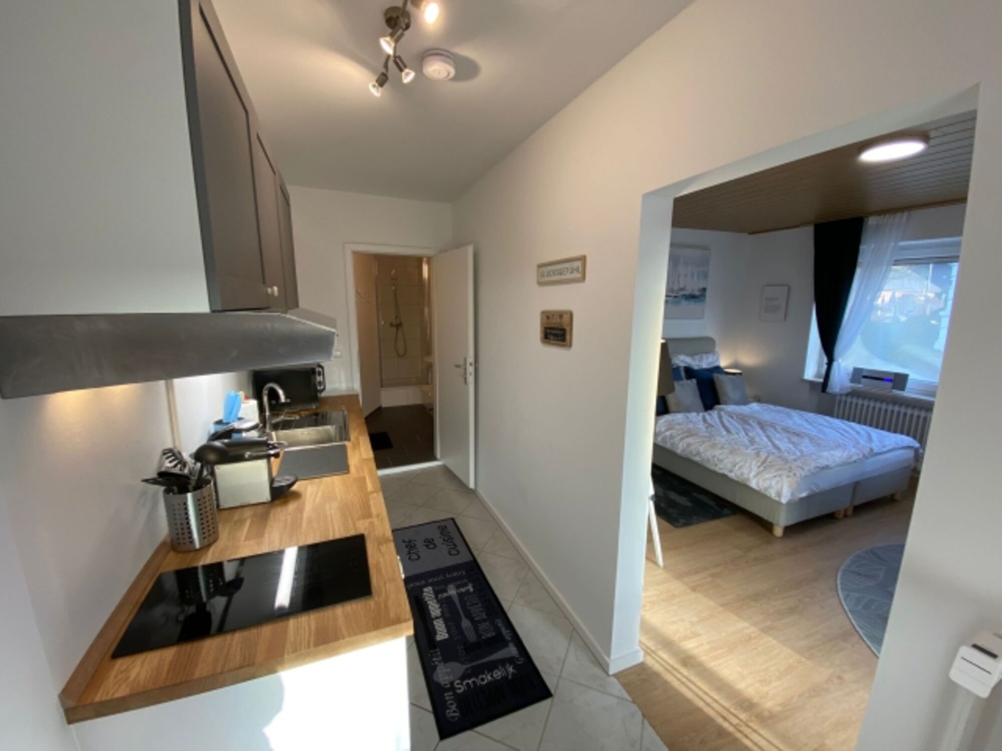 Auf ca. 35 m² bietet das Apartment Platz für bis zu drei Personen mit einem Wohn- / Schlafzimmer, einem angrenzenden Einzelzimmer, einer im Flur integrierten Küche sowie einem modernen Bad mit Dusche und WC.