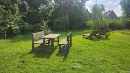 Vor der Wohnung lädt eine überdachte Terrasse mit Strandkorb und Gartenmöbeln zum Entspannen ein. Der große, eingezäunte Garten steht beiden Ferienapartments zur Verfügung und bietet verschiedene Sitzmöglichkeiten – Gartenliegen, Essplatz, Picknickbank und Gartenbank. Hier fühlen sich auch zahlreiche Vogelarten, Erdfrösche, und sogar ein Igel wohl – ein echtes Naturparadies.