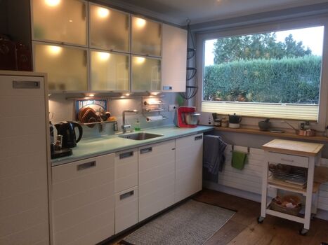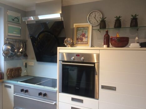4-Platten Herd, Cerankochfeld, Dunstabzugshaube, Kühlschrank mit Gefrierfach, Gefrierschrank, Nespresso-Automat, Korkenzieher / Flaschenöffner, Gewürze (Salz, Pfeffer, Zucker), Öl / Essig, Geschirrhandtücher, Mülltüten