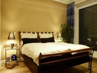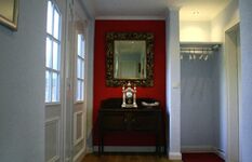 Sitzbank am Fußende des Bettes, Rossini-Bett 1,80 m x 2,20m, (Bett ist etwas höher als normal, daher bequemes sitzen). Kopfkissen 40 x 80 cm / Plumot 155 cm x 220 cm, jeweils mit Daunenfüllung für erholsamen Schlaf. Geräumiger Hülsta-Schrank. Sessel Front zum Garten komplett verglast und hat elektrische Jalousien Doppelbett 1,80 x 2,00m, Spiegel, Leselampe am Bett