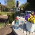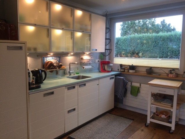 Tisch und Stühle 6 Personen auf der Terrasse vor dem Wohnzimmer, wie Tisch/Sitzbank und 2 weitere Sitzgelegenheiten auf der hinteres Terrasse am Teich. Die Terrasse am Wohnzimmer wird durch eine elektrische Markise beschattet. Eine weitere Ruheecke befindet sich auf einen Kieskarree im hinteren Bereich des Gartens. Der Teich ist gut eingewachsen und beherbergt div. Pflanzenarten, sowie Kois und 1 Schildkröte. Beleuchtungselemente für die dunklere Jahreszeit. Wegen des Teiches und der Elektrik im Garten ist unser Objekt für Kleinkinder nicht geeignet.