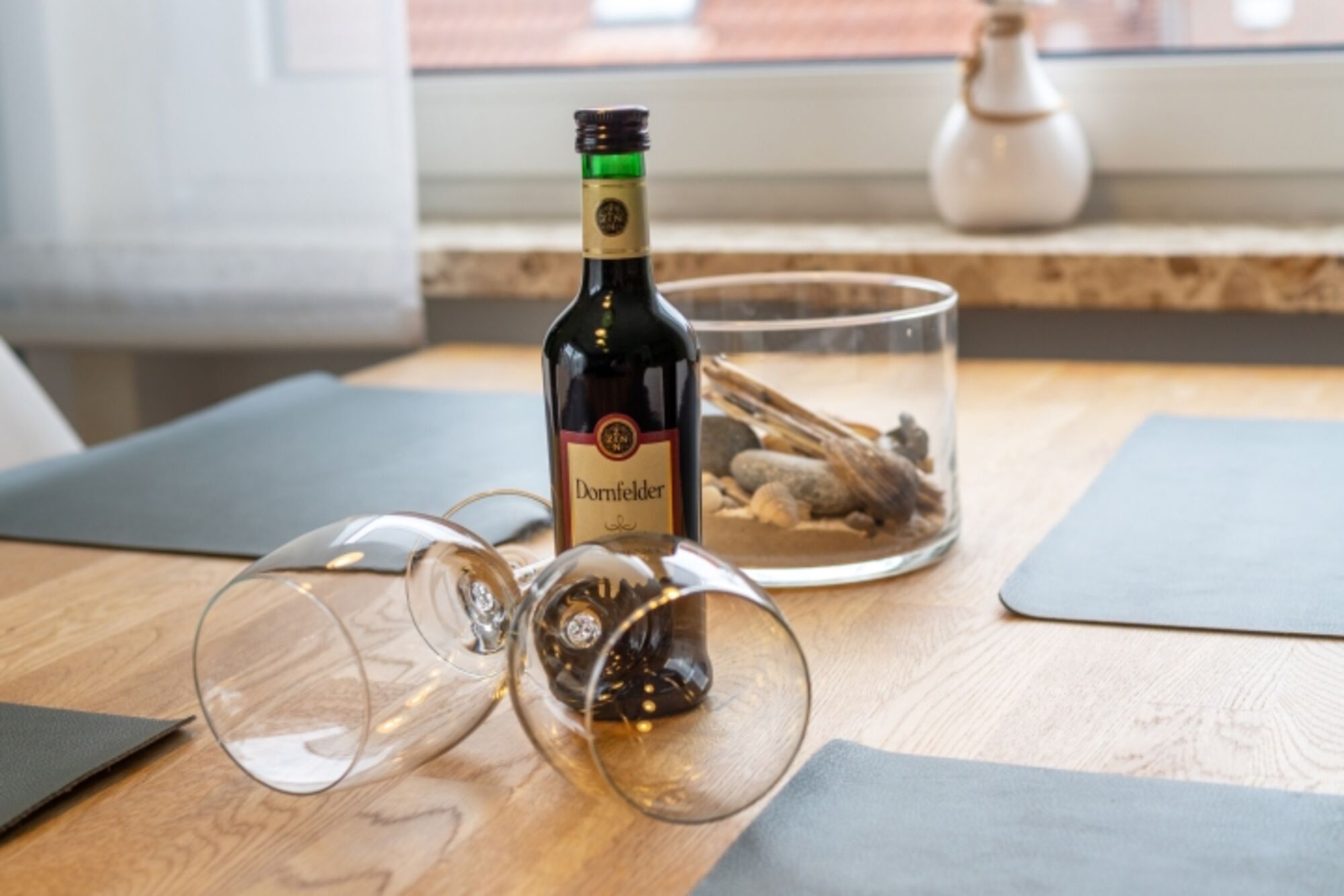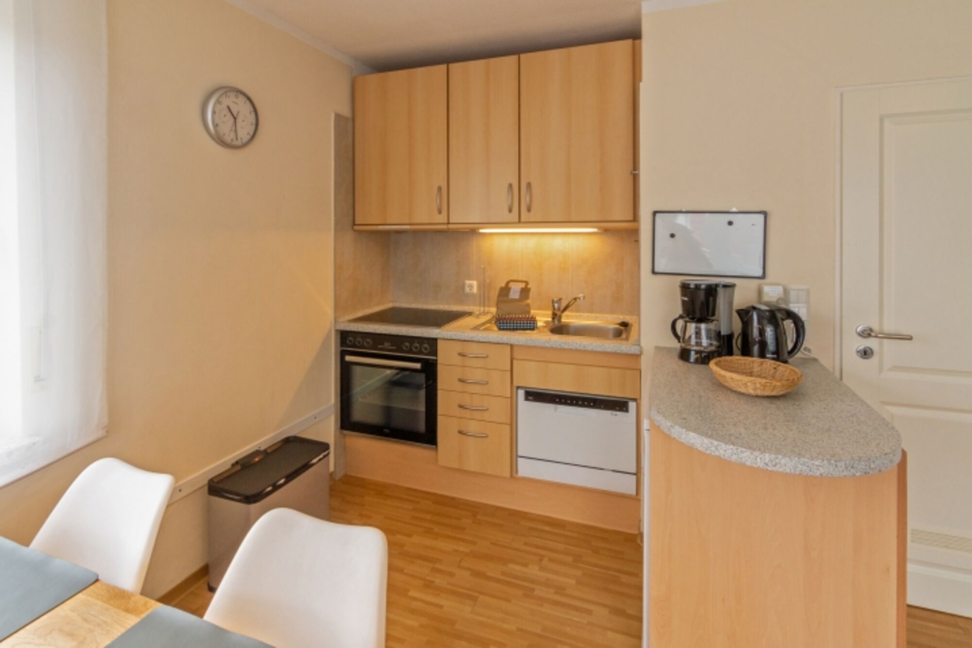 Die Küchenzeile ist ausgestattet mit einem Kühlschrank inklusive Gefrierfach, einem Cerankochfeld mit Dunstabzugshaube sowie Geschirrspüler und einem Backofen. Ferner sind ein Toaster, ein Wasserkocher und eine Kaffeemaschine vorhanden.