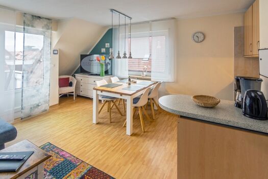Das helle Wohn-Esszimmer mit integrierter Küchenzeile lädt zum Verweilen bei einem gemeinsamen Frühstück ein.