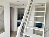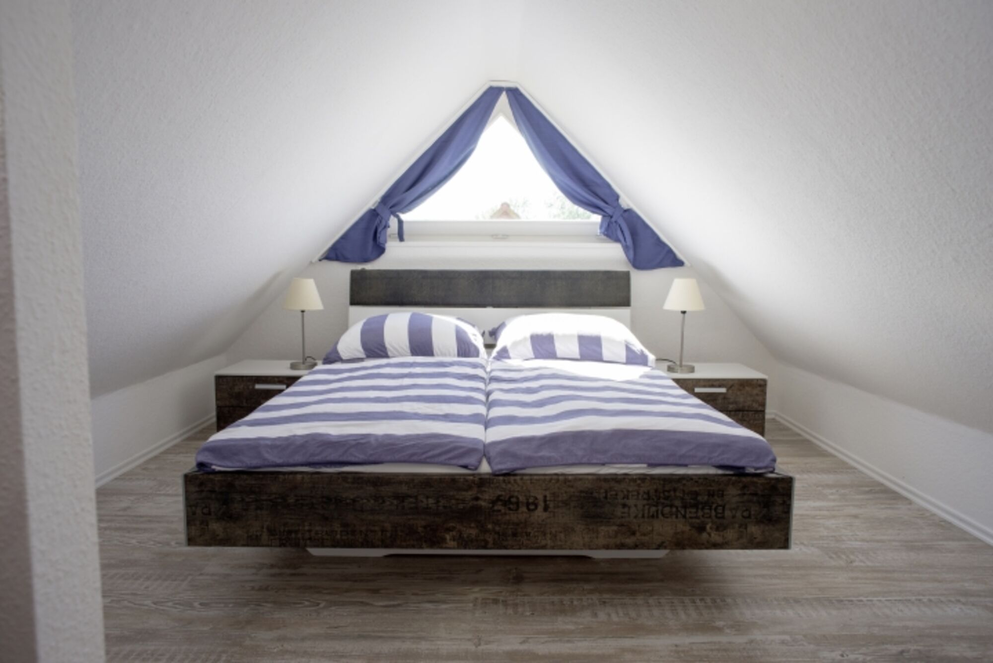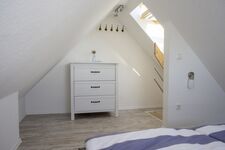 Schlafzimmer III (in der Galerie, über eine steilere Treppe erreichbar und offen zum drunterliegenden Flur): Doppelbett / Kommode