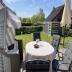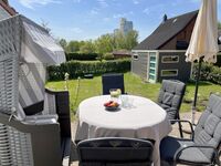 Garten: Terrasse / Strandkorb am Haus / Tisch / 5 Stühle / offene Rasenfläche / Holzkohlegrill / Sonnenschirm