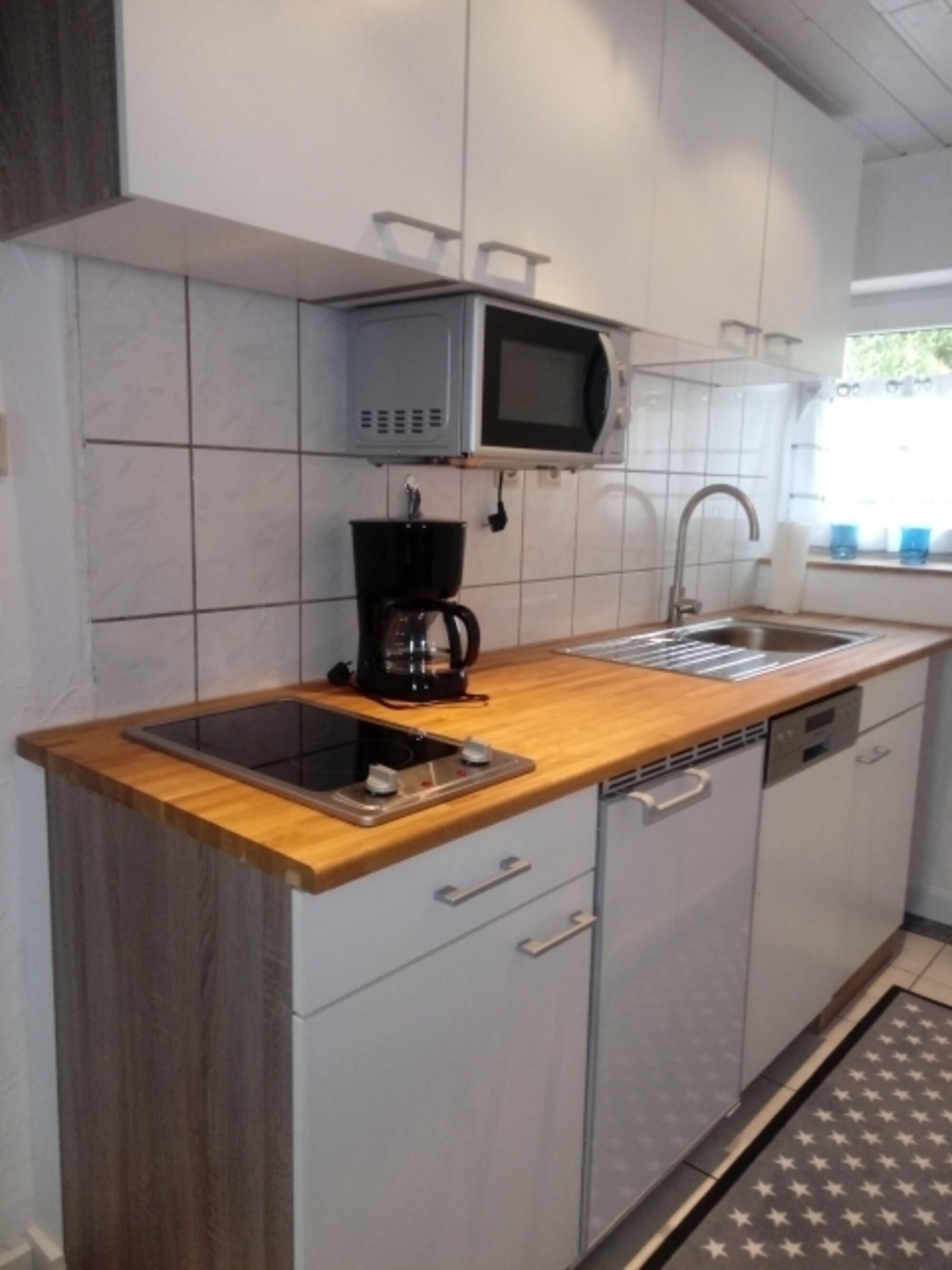 2-Platten Herd, Kühlschrank mit Gefrierfach, Korkenzieher / Flaschenöffner, Gewürze (Salz, Pfeffer, Zucker), Geschirrhandtücher, Mülltüten