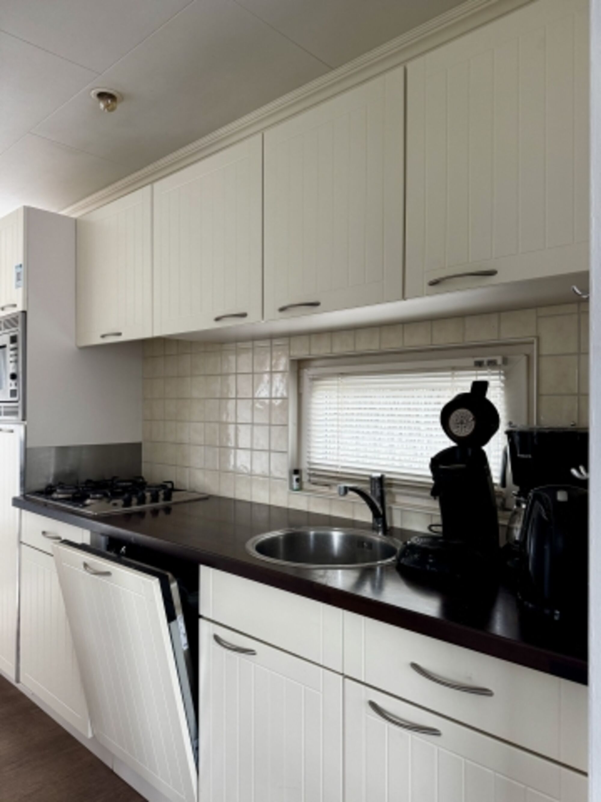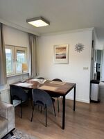 Die hochwertige, offene Küche ist komplett ausgestattet mit Gasherd, Backofen, Mikrowelle, Spülmaschine, Kühlschrank mit Gefrierfach, Kaffeemaschine, Wasserkocher sowie umfangreichen Küchenutensilien. Der angrenzende Esstisch lädt zu gemeinsamen Mahlzeiten und gemütlichen Stunden ein.