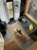 Der offene Wohnbereich mit Pelletofen, gemütlicher Sofaecke und Sat-TV lädt zu Kuschelabenden ein. In der offenen Küche zaubert ihr gemeinsam kleine Lieblingsgerichte, während das Oberlicht im Loft-Schlafbereich euch nachts den Sternenhimmel zeigt.