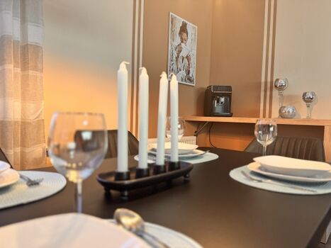 ✔️ Großes, helles Wohn- und Esszimmer mit 55-Zoll-Smart-TV und Elektrokamin