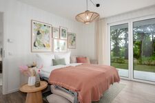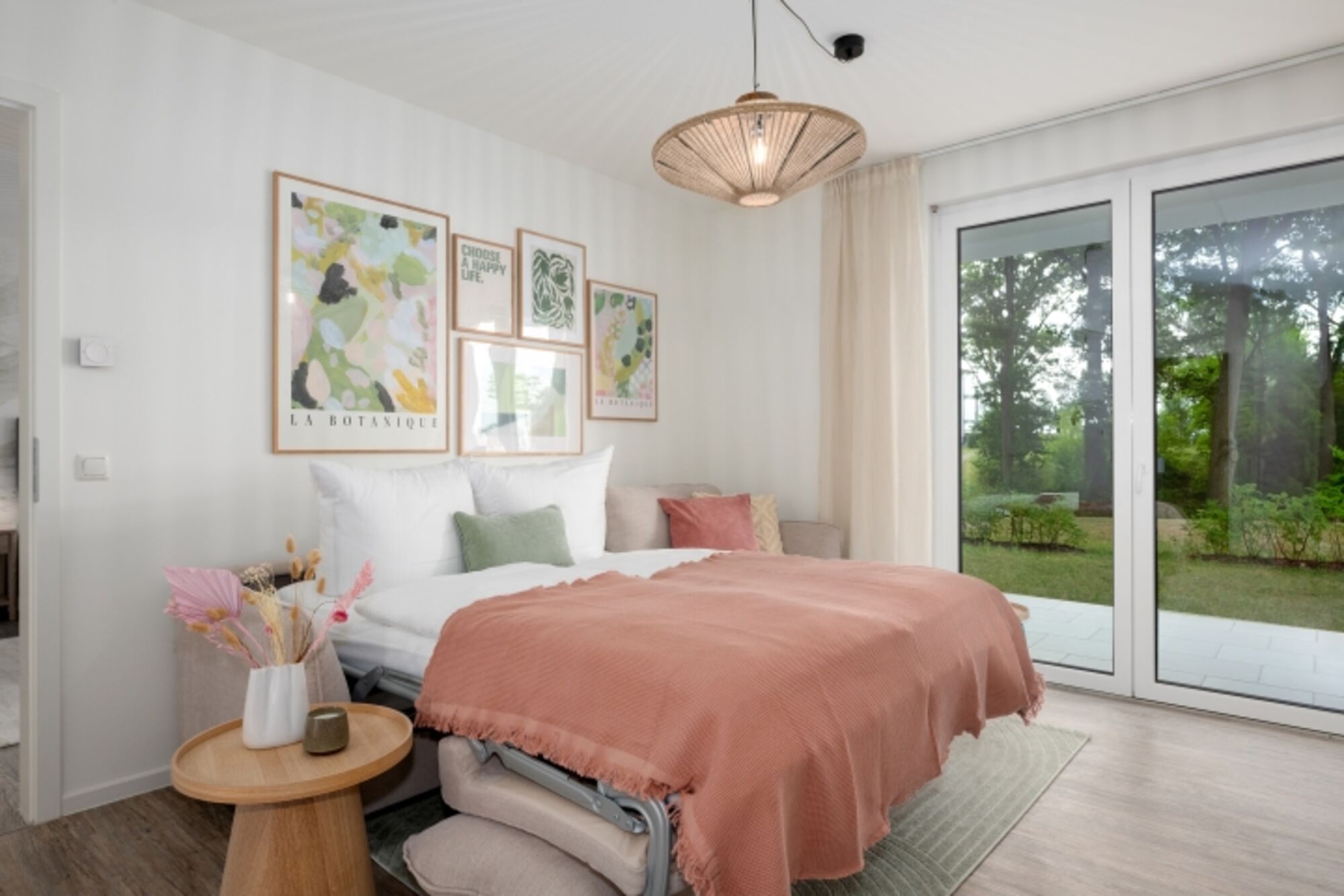 Im separaten Schlafzimmer mit komfortablem Doppelbett in Überlänge (2,10 m) finden Sie erholsamen Schlaf. Das moderne Duschbad bietet praktischen Komfort im Alltag. Der offene Wohnbereich mit Schlafcouch und direktem Zugang zur möblierten Sonnenterrasse lädt zu entspannten Stunden im Freien ein – ob beim Frühstück oder einem ruhigen Abend mit Blick ins Grüne.