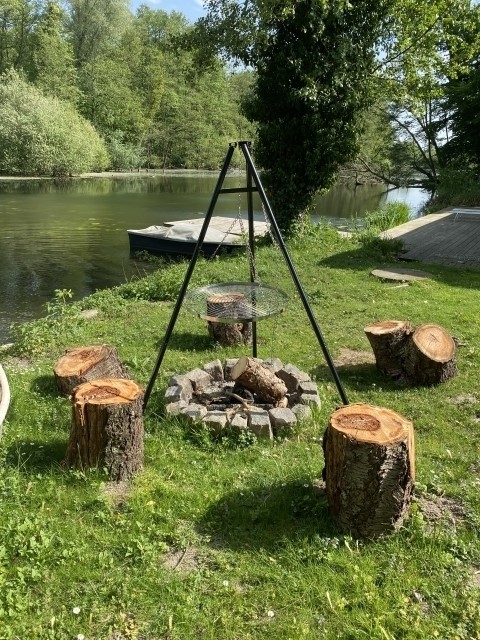 Mit dem Schwenkgrill kann über der Feuerstelle gegrillt werden (hierfür am besten Holzkohle mitbringen).