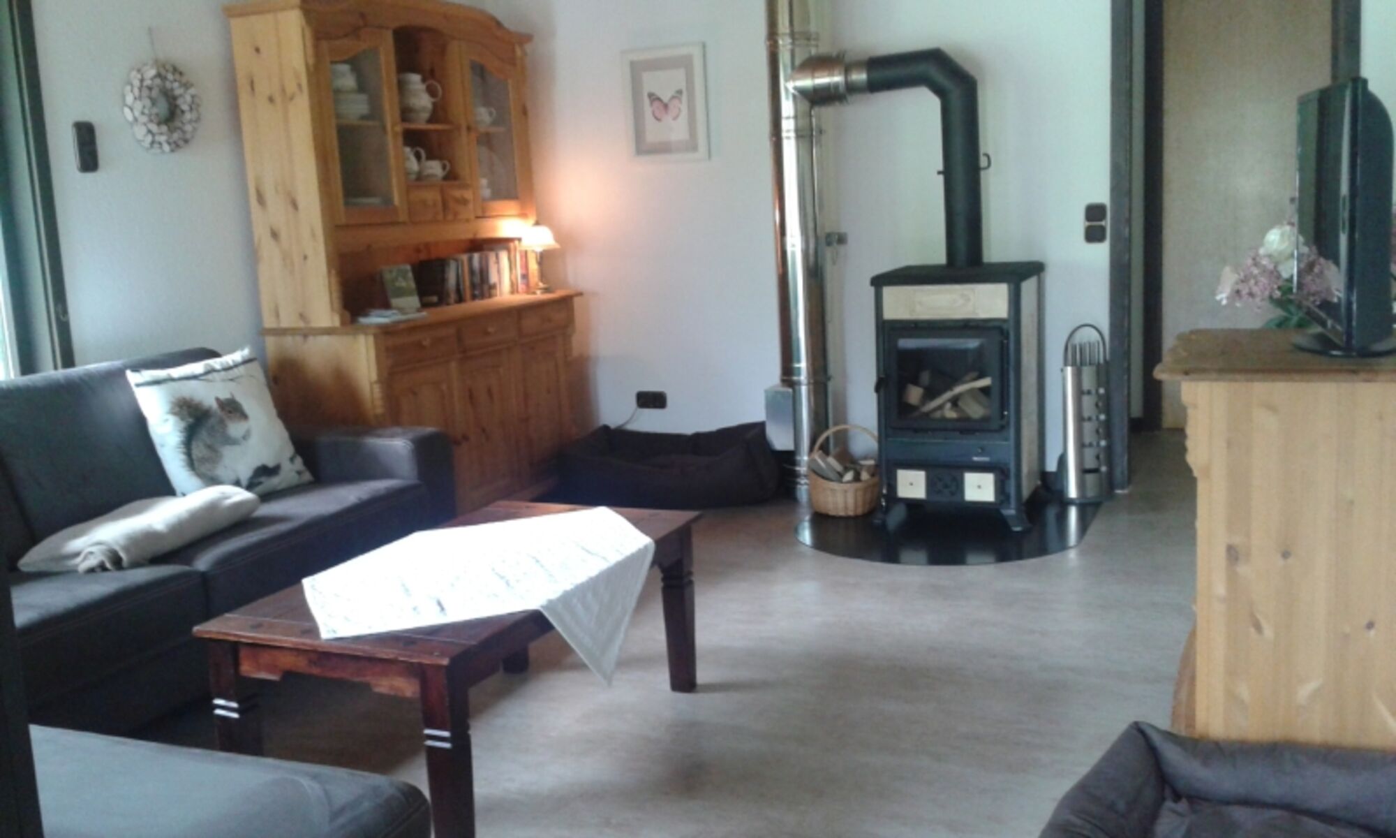 TV-Sat, TV-Flachbildschirm, Blu-Ray-Player, Bücher, Kaminofen, Eckcouch