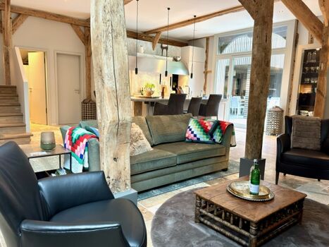 Das BunnyHuus Scheunen-Loft ist der großzügige, lichtdurchflutete hintere Bereich unseres historischen Reetdachhauses. Hier verbindet sich offenes, modernes Design mit ländlichem Charme: Genießt den Wohn-/Schlafbereich mit Panoramablick direkt auf die Pferdekoppel, die hochwertige Siematic-Küche mit Miele-Geräten und eine große private Terrasse mit Grill. Fitness-Fans können den top ausgestatteten Trainingsbereich (Peloton, Laufband, Rudergerät) nutzen. Das Loft ist ideal für Familien, Freunde oder Aktivreisende, die Wert auf viel Platz, Natur und Komfort legen. Hunde willkommen, Wohlfühlatmosphäre garantiert!