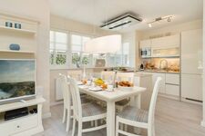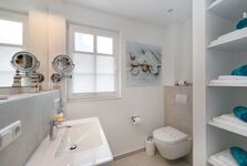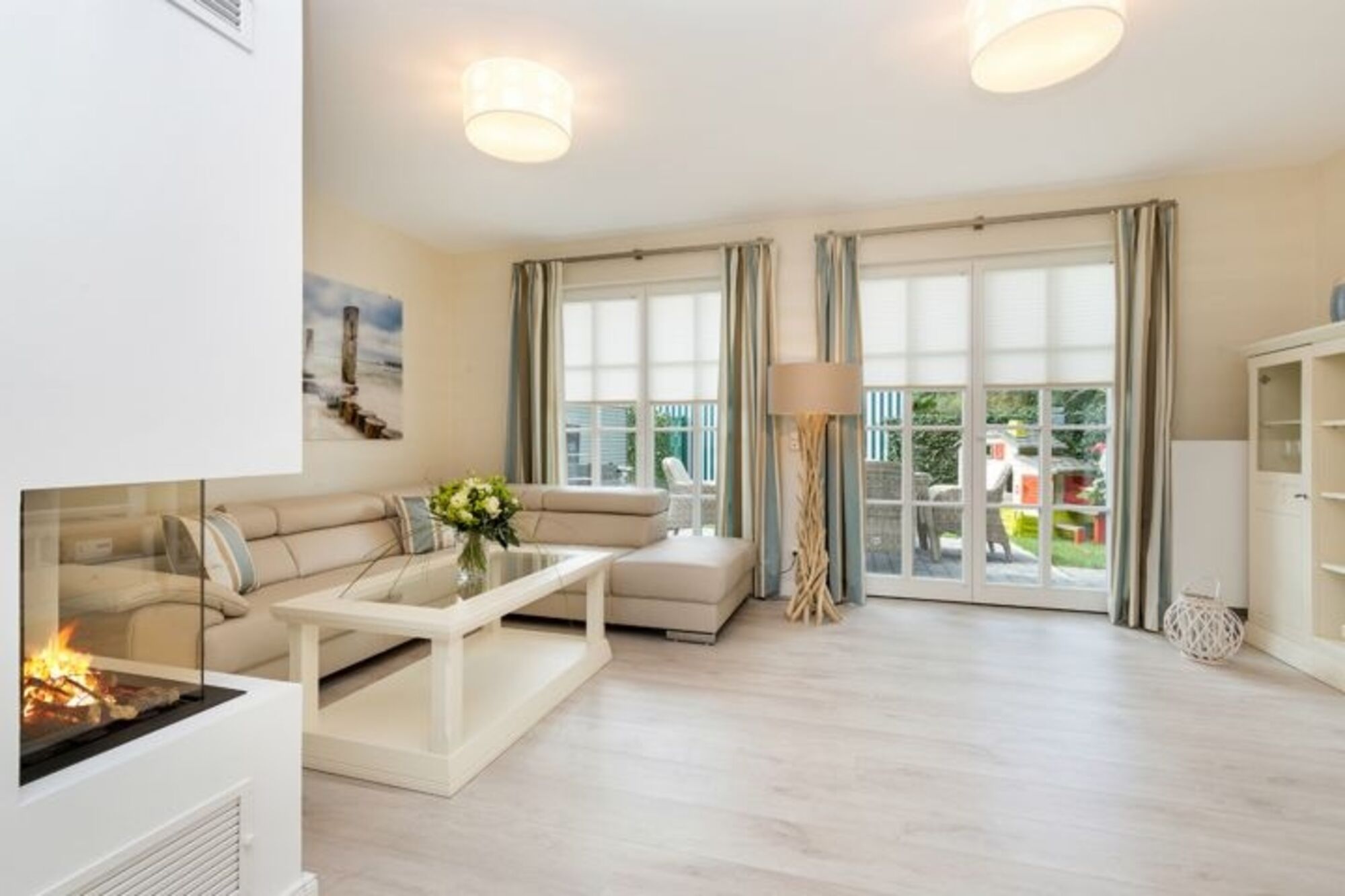 Im Erdgeschoss erwartet unsere Gäste ein großzügiges Wohn-/Esszimmer, u. a. mit Einbaukamin, eine Essgruppe für 6 Personen, Ecksofa mit Ottomane, eine komplett ausgestattete Wohnküche (s. o.), ein Bad mit Whirlpool, ein Flur mit Garderobe sowie ein Hauswirtschaftsraum. Der Wohn- und Essbereich ist dank der bodentiefen, zum Garten ausgerichteten Terrassenfenster und der in hellen Tönen gehaltenen Einrichtung, lichtdurchflutet und sehr freundlich ausgestaltet.