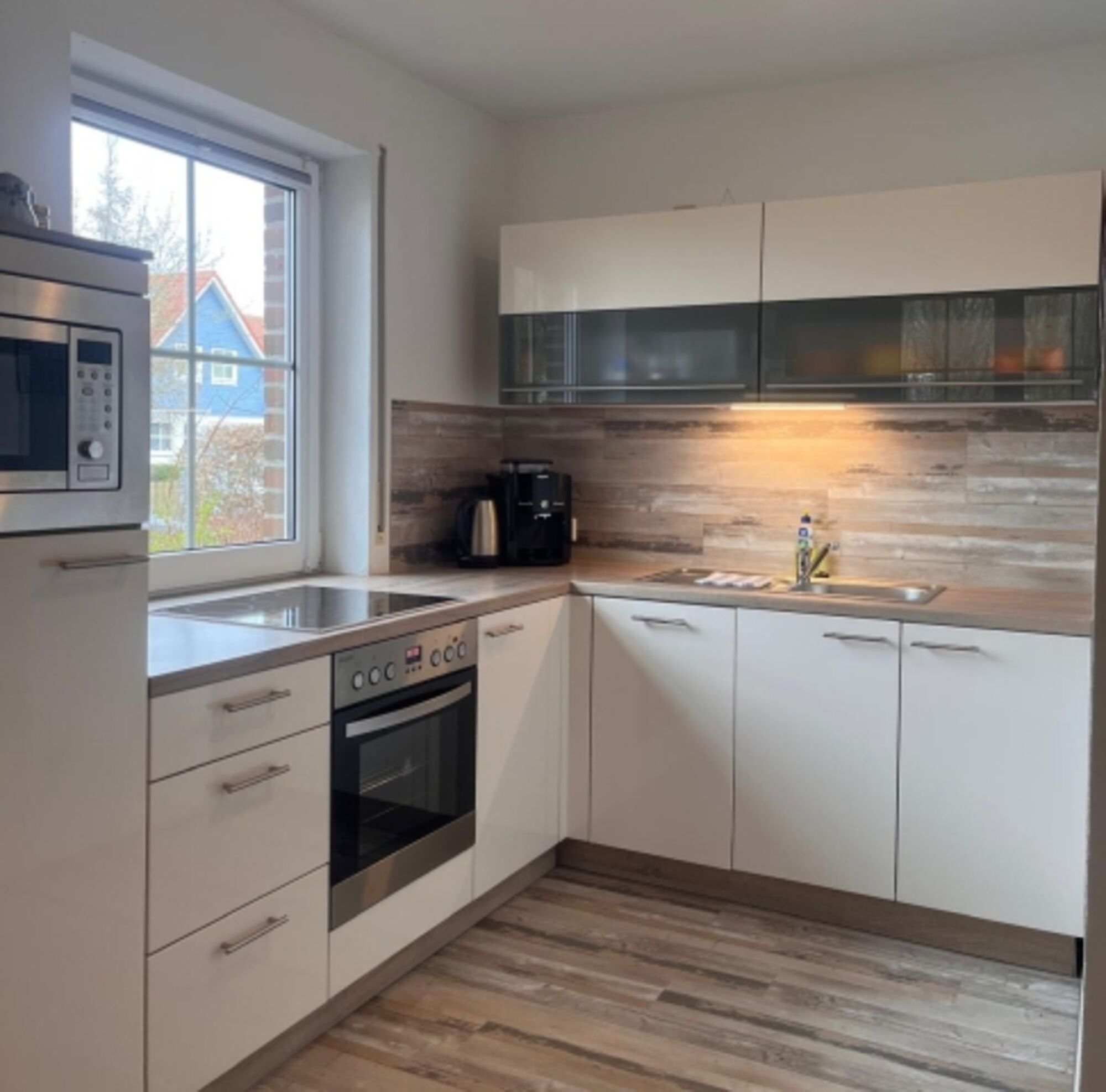 Cerankochfeld, Kühlschrank mit Gefrierfach, Korkenzieher / Flaschenöffner, Gewürze (Salz, Pfeffer, Zucker), Geschirrhandtücher