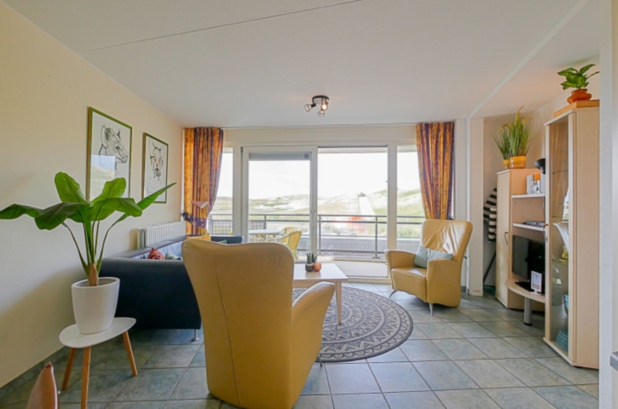 Die Ferienwohnung ist freundlich und farbenfroh eingerichtet und vermittelt sofort ein angenehmes Urlaubsgefühl. Im hellen Wohnzimmer mit komfortabler Sitz- und Essecke genießen Sie den weiten Blick auf die Dünenlandschaft. Die offene, komplett ausgestattete Küche bietet alles, was Sie für einen entspannten Aufenthalt benötigen. Zwei Schlafzimmer stehen zur Verfügung, eines davon innenliegend ohne Fenster. Das Badezimmer ist mit Dusche, Waschbecken und einer praktischen Waschmaschine ausgestattet. Besonders schön ist der großzügige Balkon, von dem aus Sie den herrlichen Blick auf die Dünen und das angrenzende Naturgebiet genießen können – perfekt für ein sonniges Frühstück oder einen entspannten Abend an der frischen Meeresluft.