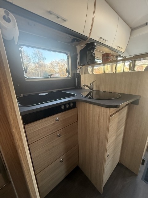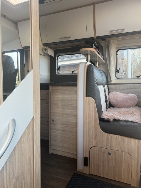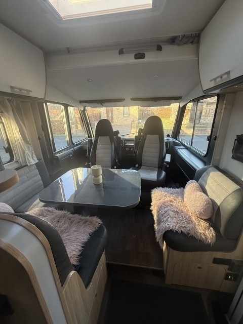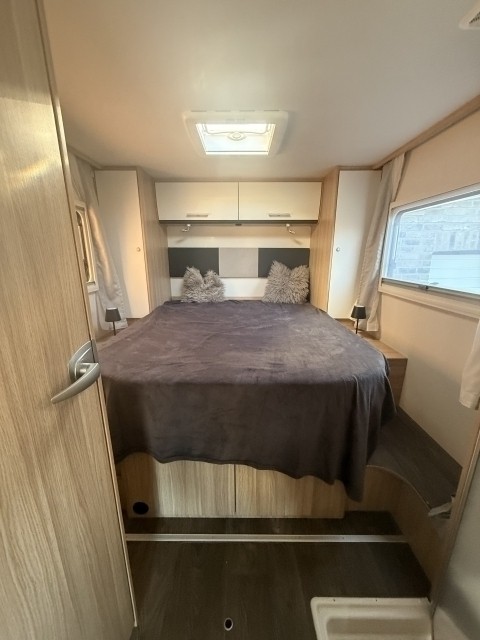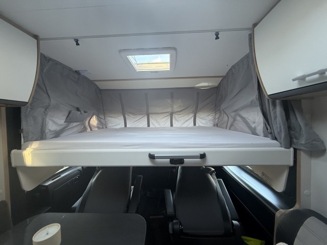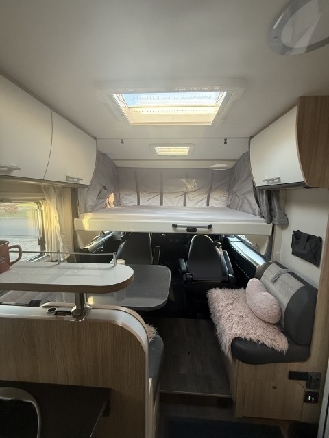 Er bietet Platz für 4 Personen. Das Hubbett vorne ist 150x200 und das Bett hinten 150x195.