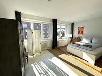 heller Raum mit viel Platz, Beeindruckender Blick auf den Elbarm & die Speicherstadt Viele Fenster für viel Tageslicht und Weitsicht, Stilvolle, moderne Einrichtung Doppelbett 1,80 x 2,00m, Leselampe am Bett, Fliegengitter