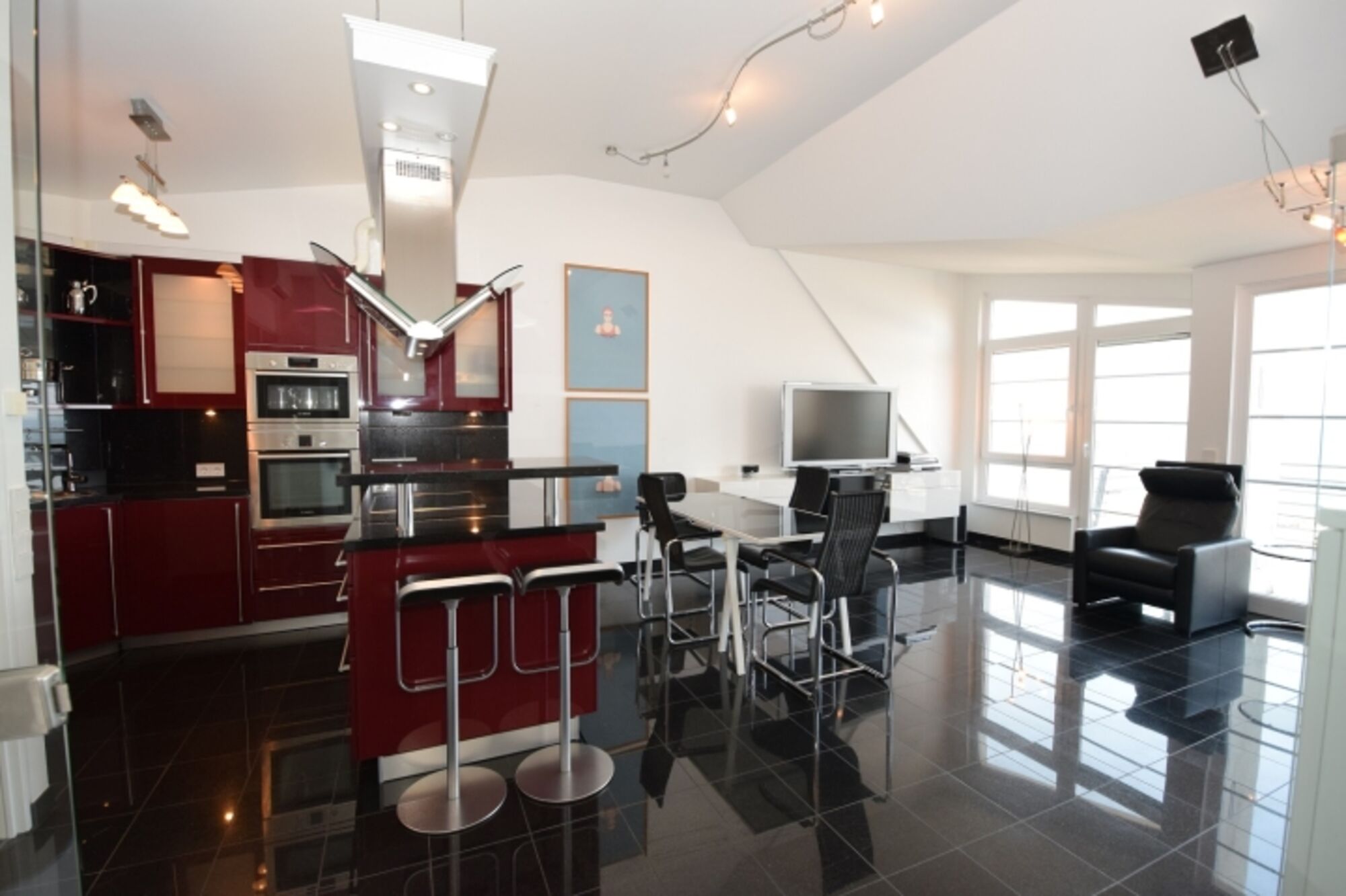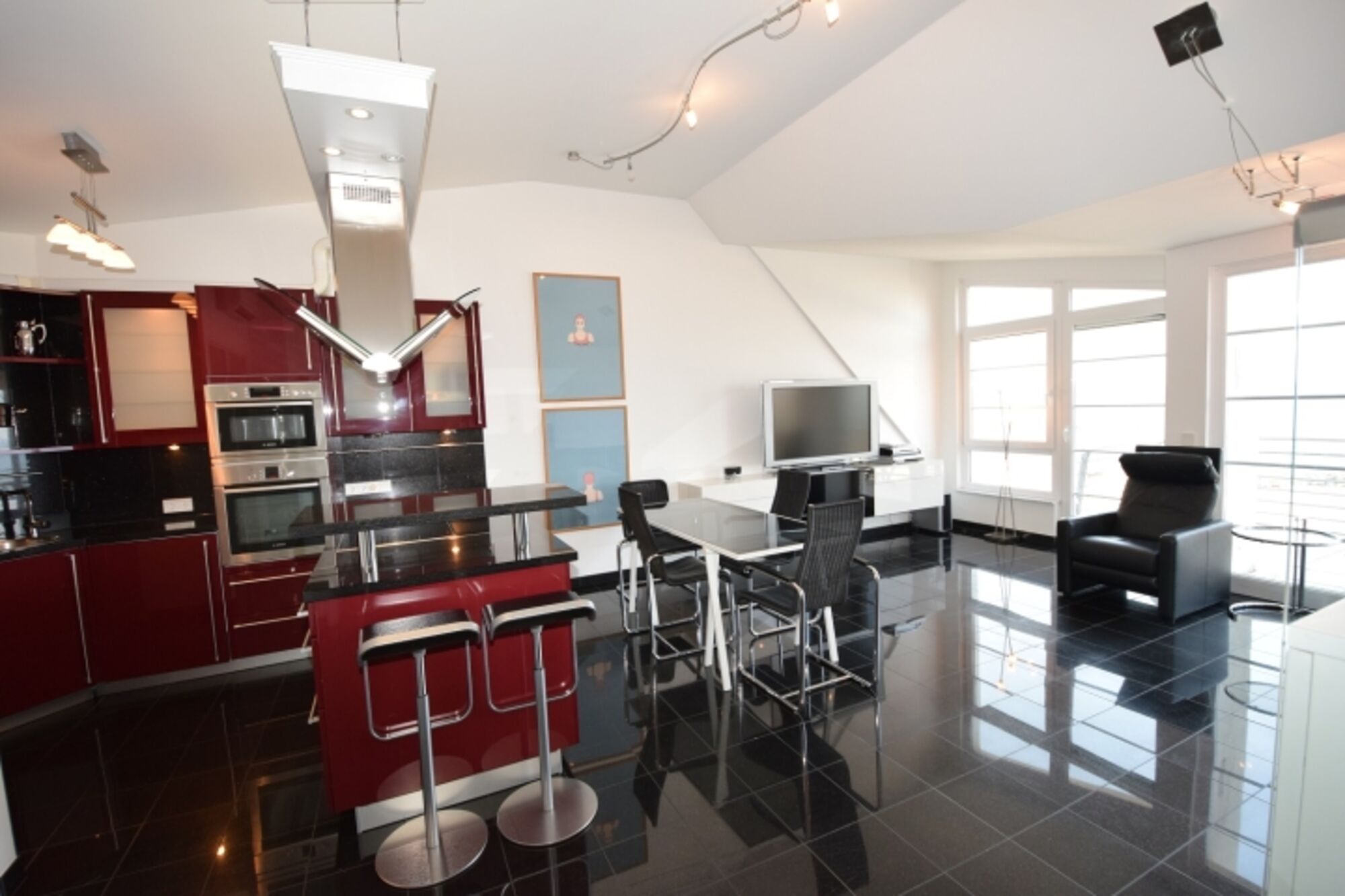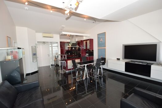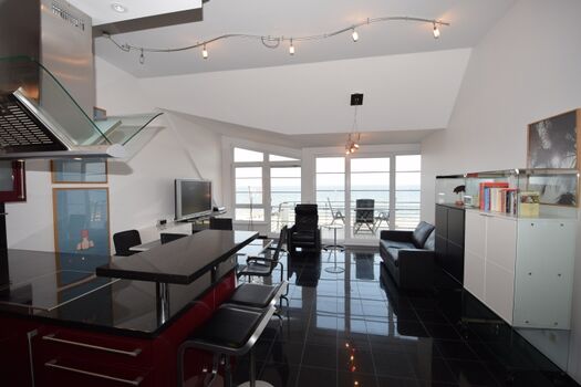 Der helle Wohnraum mit großen Fensterfronten und Zugang zum schönen Balkon teilt sich in einen Wohnbereich und die Essecke mit angrenzender Küchenzeile. Die Küche ist modern und offen gestalte. So finden sich hier neben einem Geschirrspüler auch Herd und Backofen, Kühlschrank mit Gefriermöglichkeit und zahlreiche weitere Küchenutensilien. Ein Toaster, eine Kaffeemaschine sowie ein Wasserkocher sind ebenfalls zu finden.