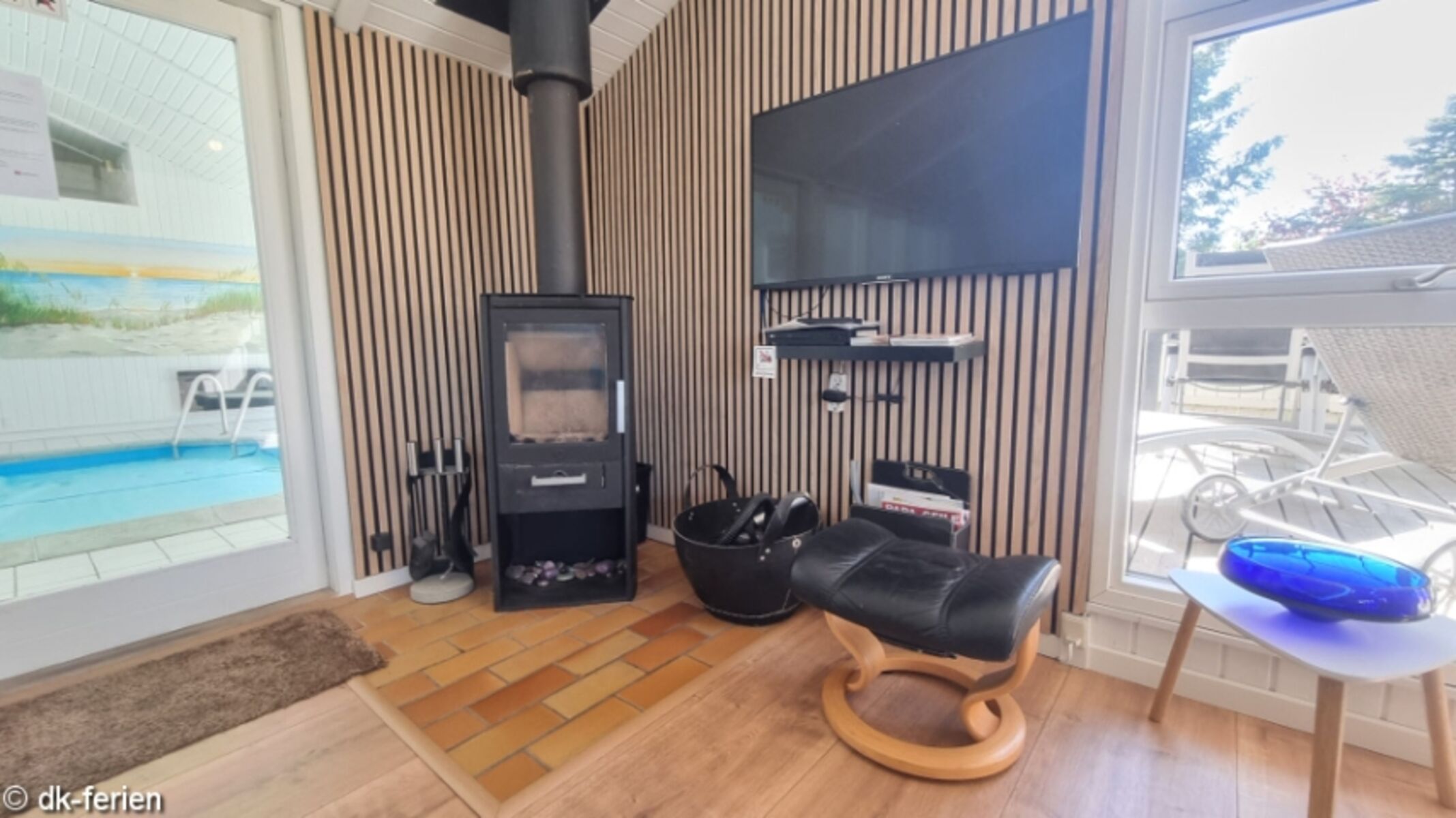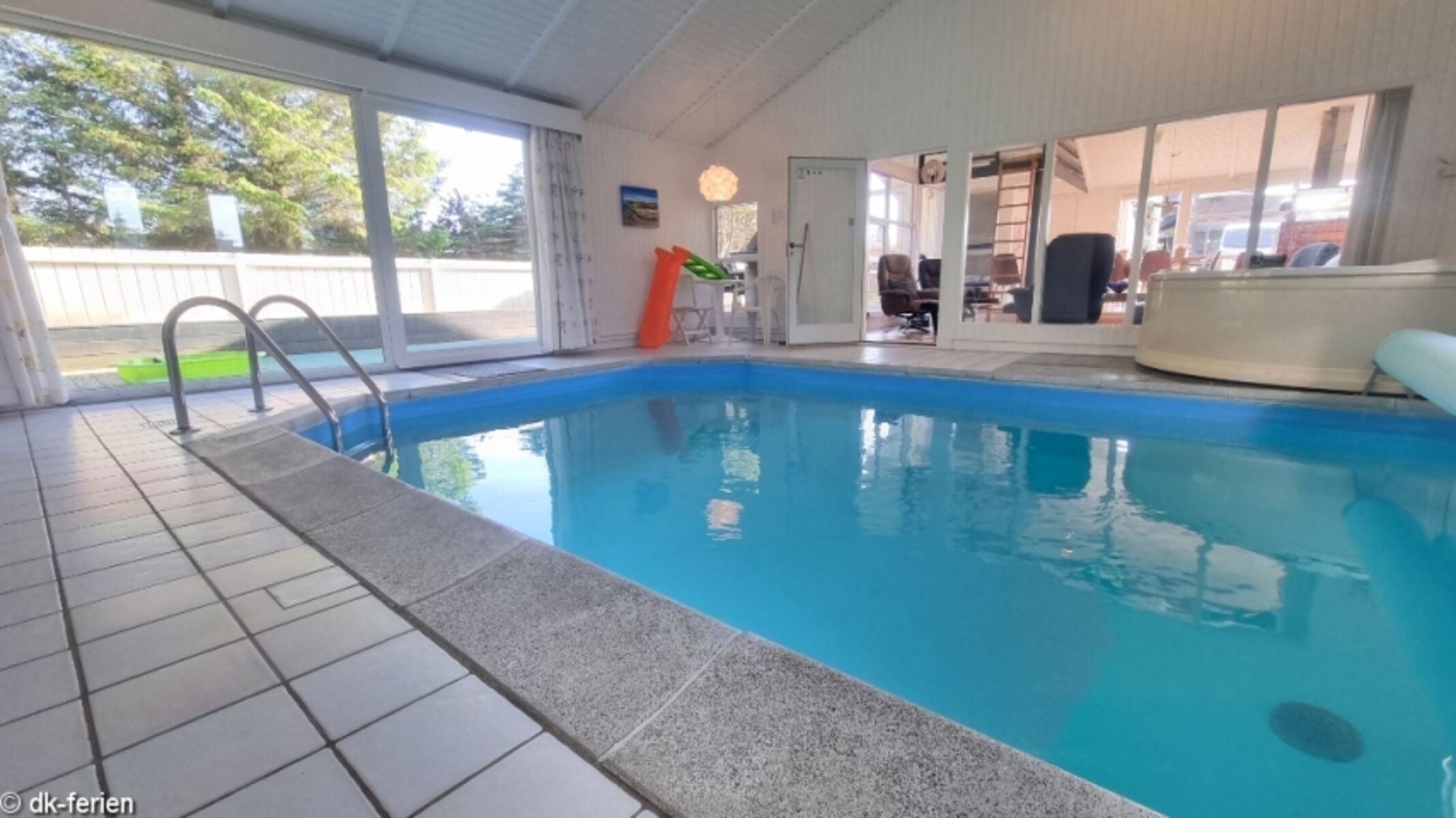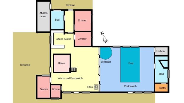 Innen erwartet dich eine einladende, gepflegte Atmosphäre mit moderner Ausstattung. Das Highlight des Hauses ist der Poolbereich mit einem 17m² großen Swimmingpool, in dem Groß und Klein nach Herzenslust planschen können. Für dein persönliches Wellnessprogramm stehen außerdem Whirlpool und Sauna bereit.