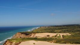 Mitten in der Dünenlandschaft am Horizont ist die Nordsee zu sehen