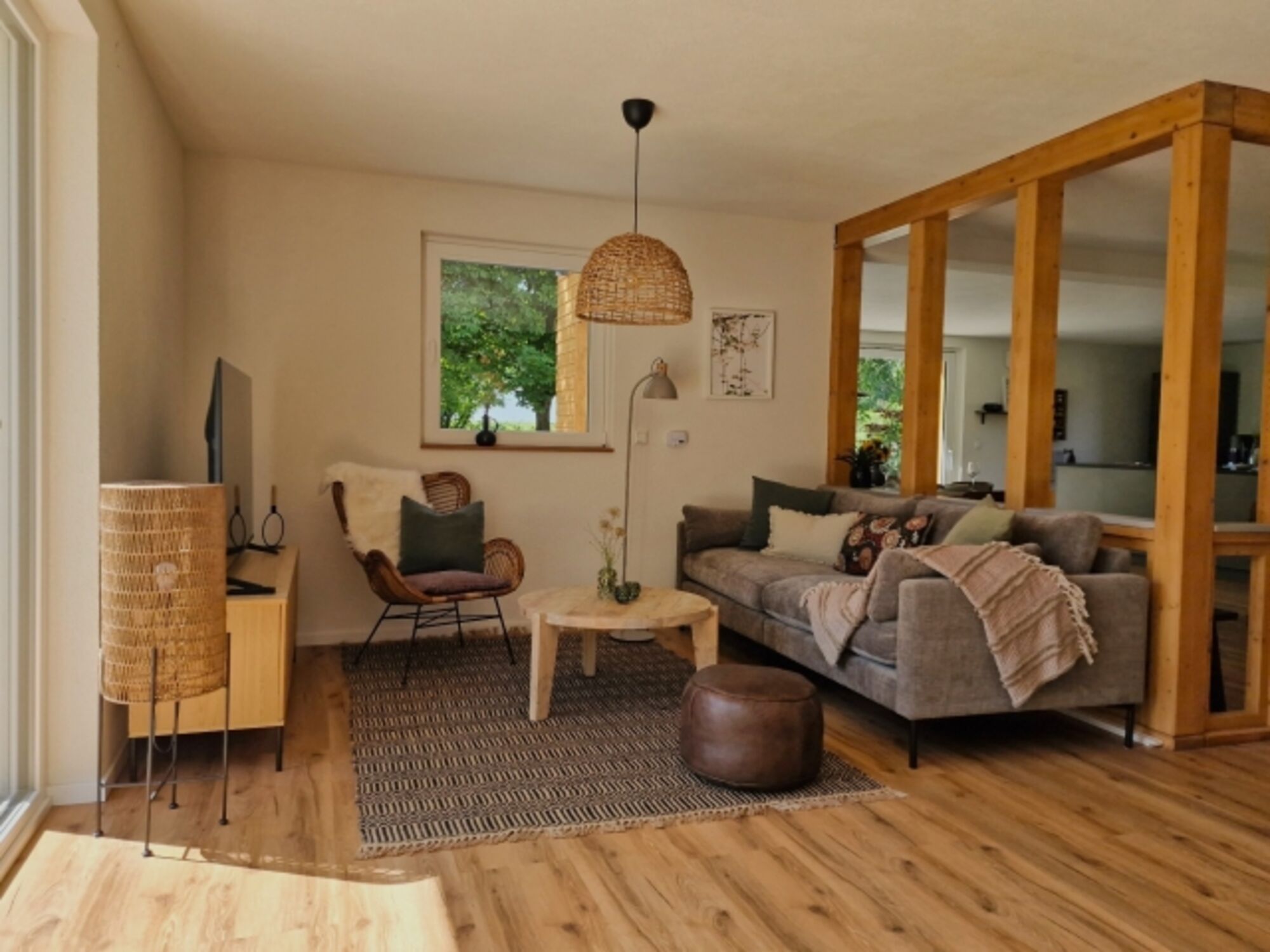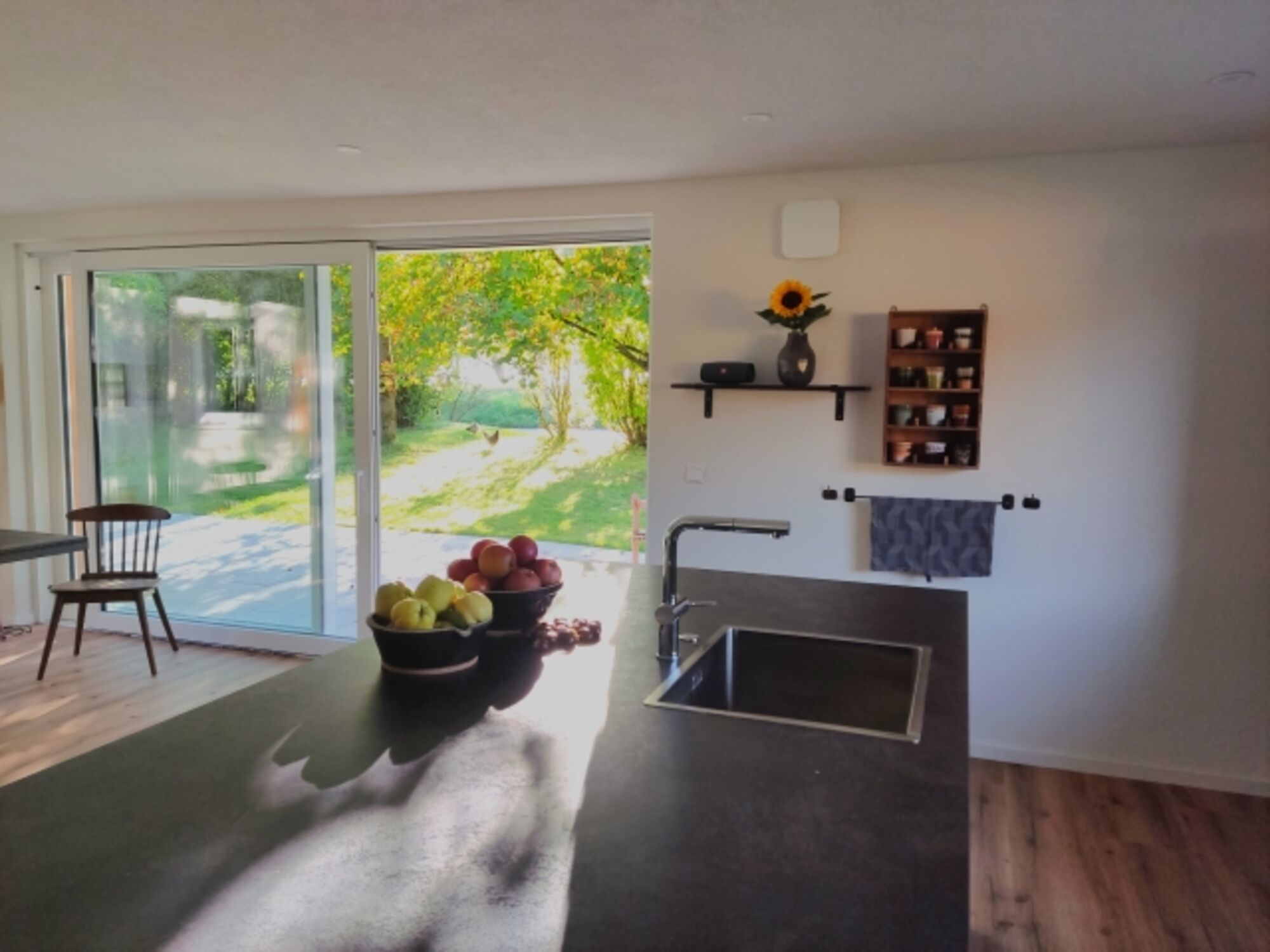 Sie bewohnen ein Haus alleine. Die Inneneinrichtung ist mit harmonischen Farben und klaren Linien einladend gestaltet. Der offene Wohn-, Ess- und Küchenbereich bietet mit den großen Fenstern einen direkten Blick in die Natur. Die moderne Küche lädt zum gemeinsamen Kochen ein. Am zentralen Esstisch kann gegessen, gespielt und gelacht werden. Für behagliche Abende sorgt der Kamin. Musiker*Innen freuen sich über das Klavier und die Ukulele.