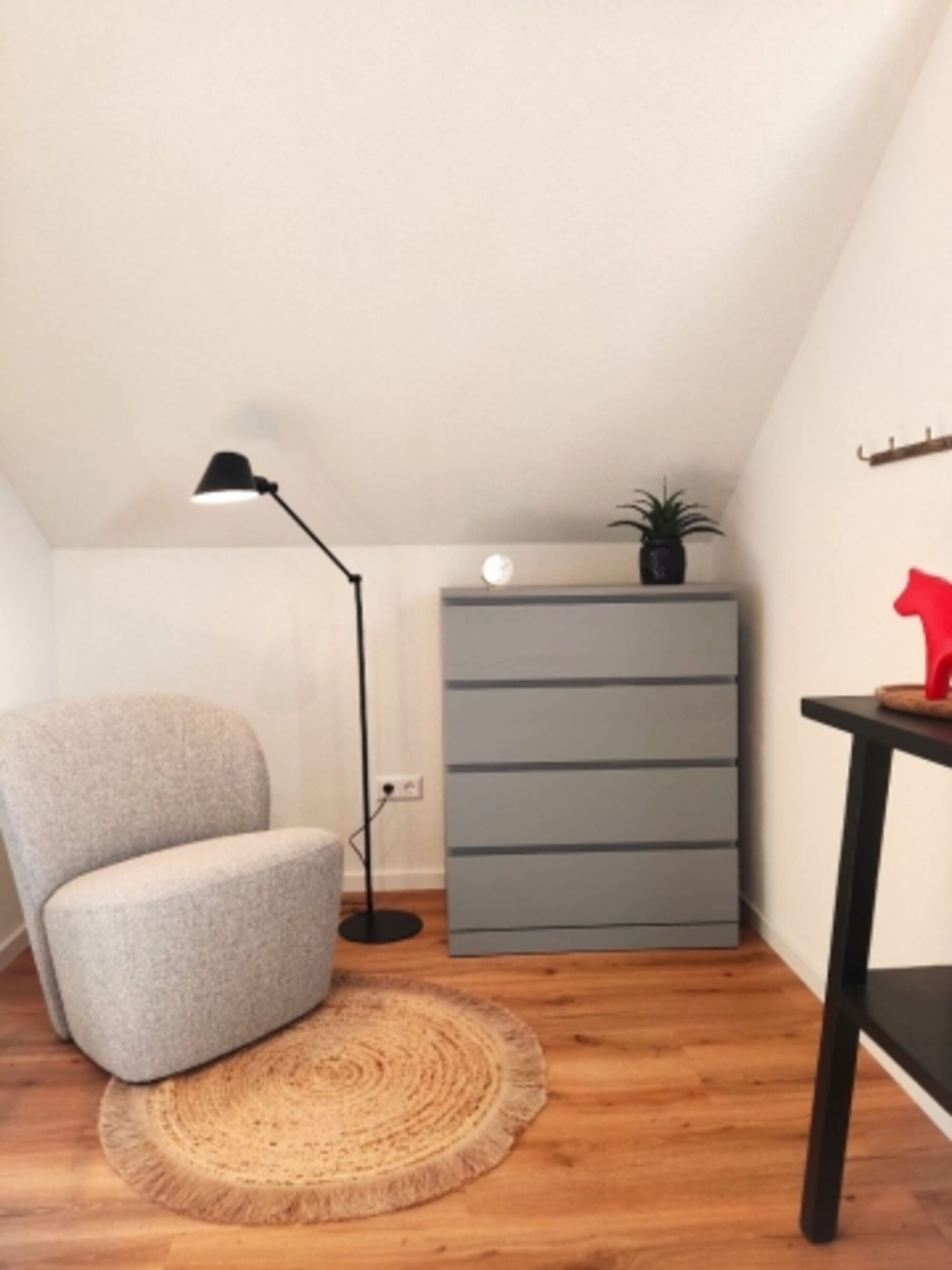 Zugang zur Dachterrasse, Verdunklung mit Vorhang. Doppelbett 1,80 x 2,00m, Kommode, Leselampe am Bett