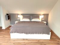 Schlafzimmer mit Doppelbett und Dachterrasse, ein weiteres Schlafzimmer mit Doppelbett. Bad mit bodengleicher Dusche und WC.