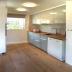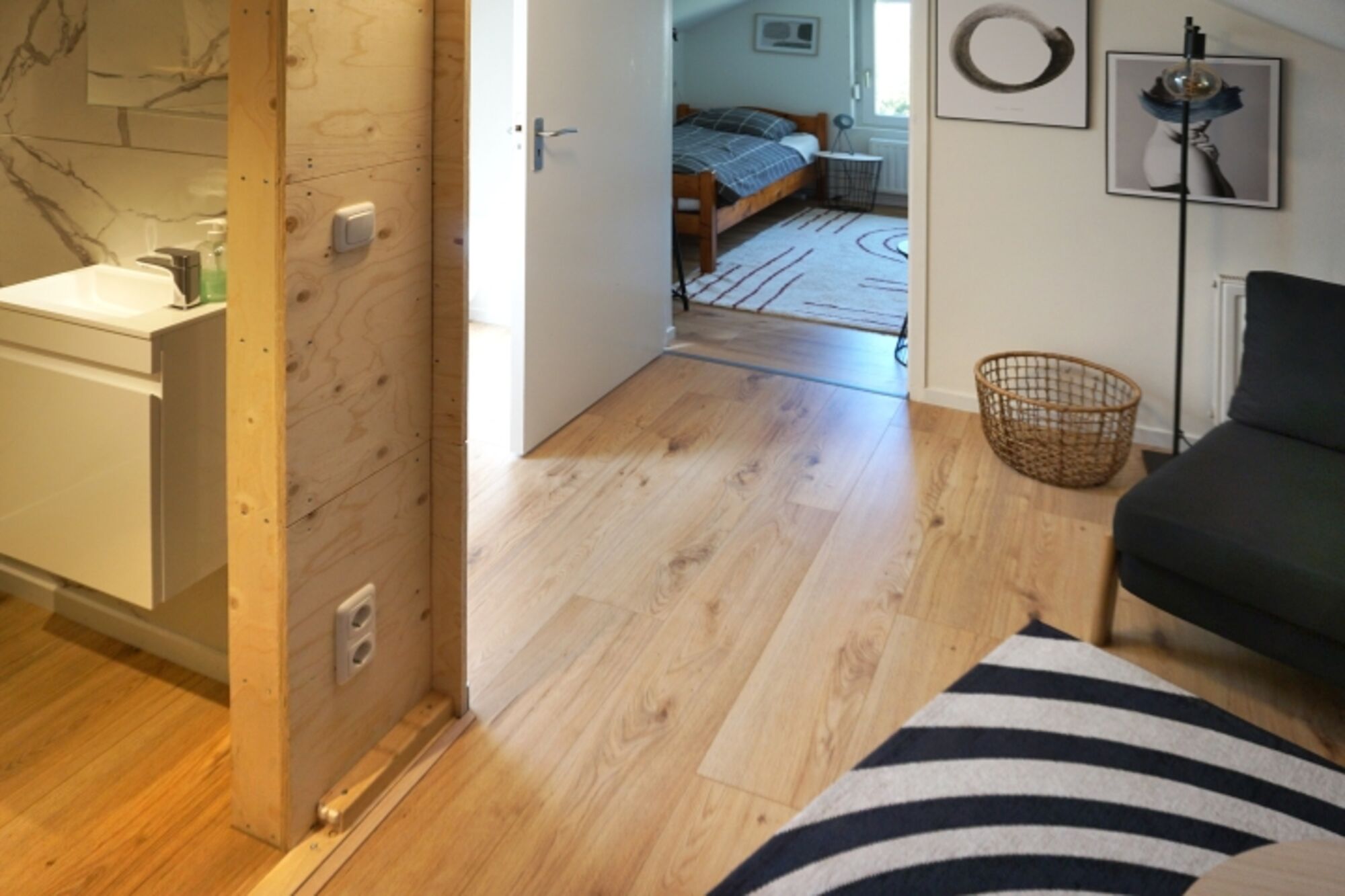 Das Badezimmer wurde kürzlich komplett renoviert und verfügt über eine ebenerdige Dusche mit Glasschiebetür, ein wandhängendes WC und einen Waschtisch. Zum Haus gehört ein großzügiger Garten mit Rasen und eine überdachte Terrasse mit Gartenmöbeln.