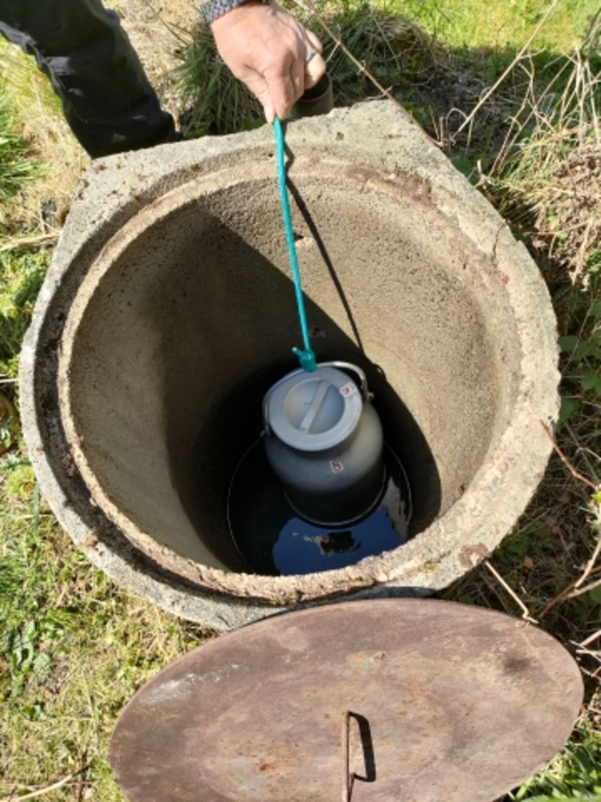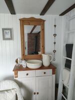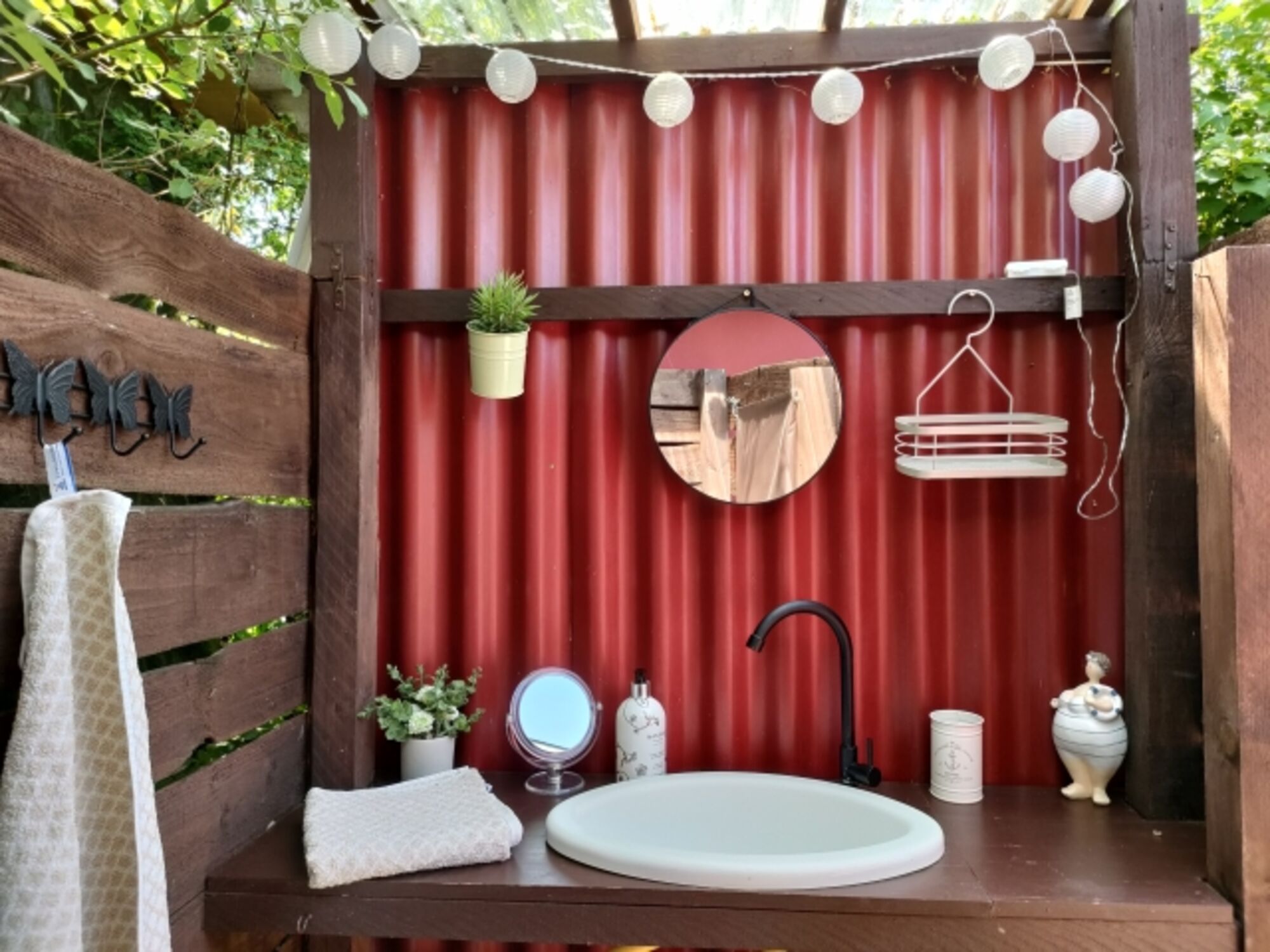 Die Waschstelle ist überdacht und mit einer Campingdusche ausgestattet. Am Waschbecken gibt es nur kaltes Wasser. Die Toilette ist eine Trocken-Trenntoilette. Waschbecken, Spiegel