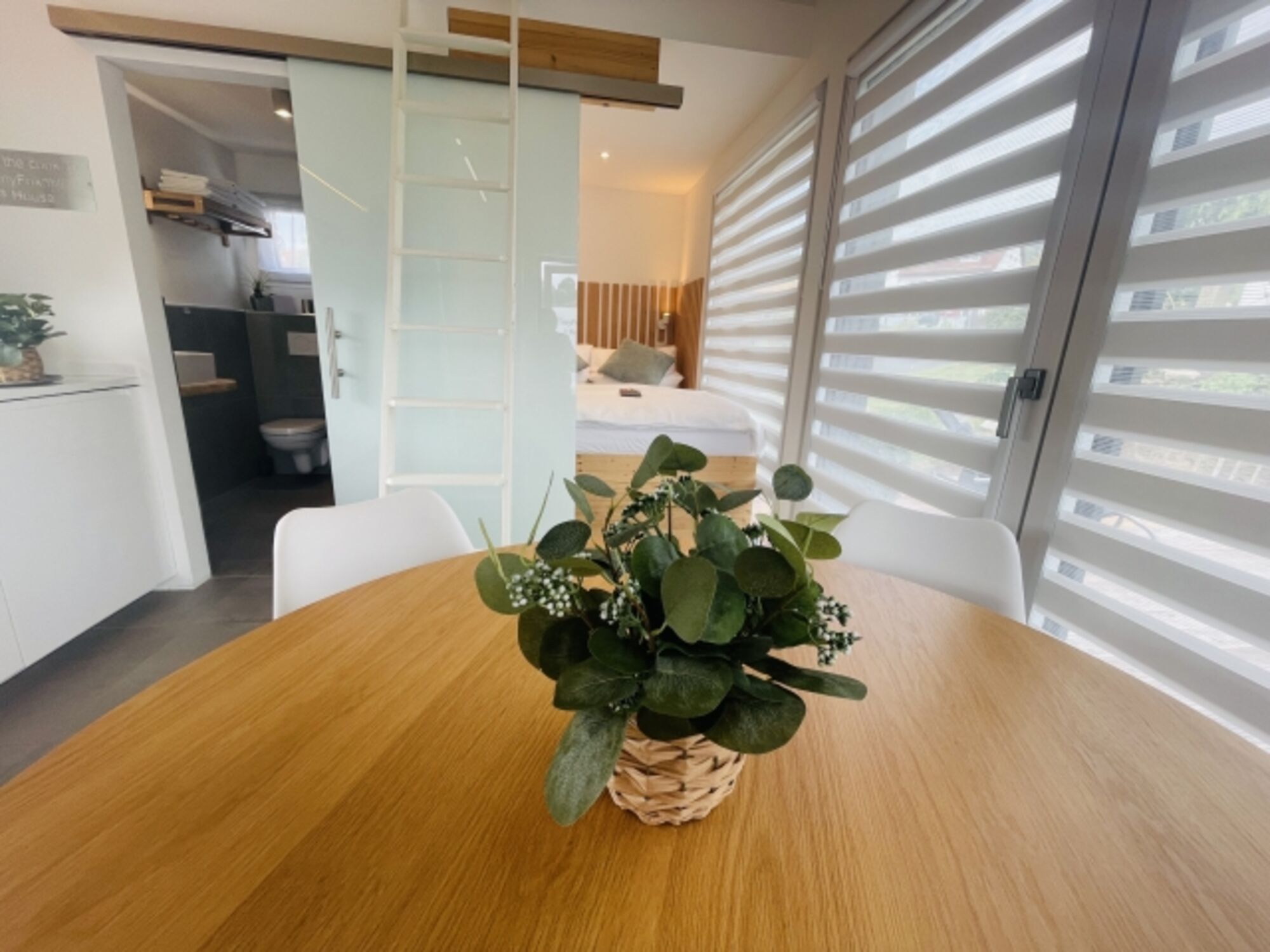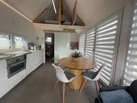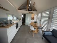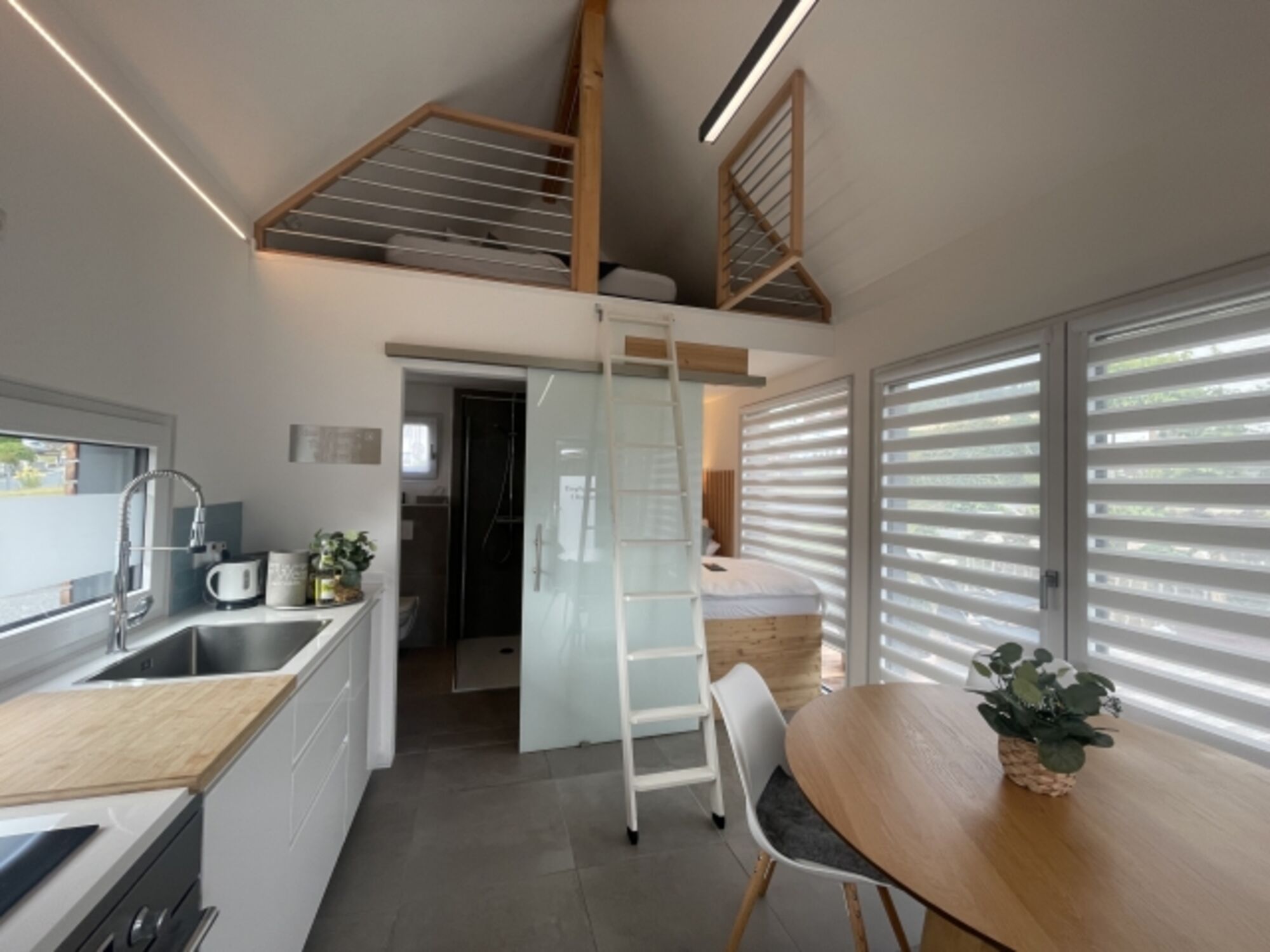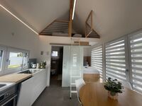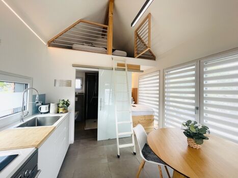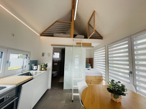 Das Tinyhaus ist trotz kompakter Größe sehr hochwertig ausgestattet und bietet alles, was man für einen erholsamen Aufenthalt braucht: gemütlicher Wohnbereich, voll ausgestattete Küche, bequeme Betten sowie eine Terrasse mit Blick ins Grüne.