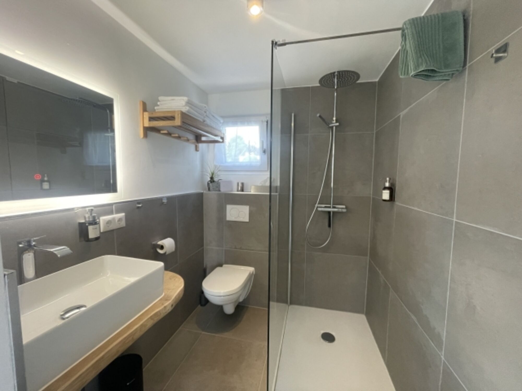 LED - Spiegel und Waschtisch aus massiver Eiche Waschbecken, Regendusche, Kosmetiktücher, Spiegel, Fenster im Bad