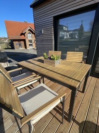 - Terrasse mit Liegestühlen und Gartenmöbeln, ab Sommer 2026 überdacht und eingezäunt