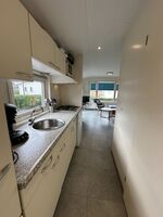 Die offene Küche ist komplett ausgestattet mit Gasherd, Backofen, Mikrowelle, Spülmaschine, Kühlschrank mit Gefrierfach, Kaffeemaschine, Wasserkocher und umfangreichen Küchenutensilien - ideal für gemeinsame Mahlzeiten nach einem Strandtag.