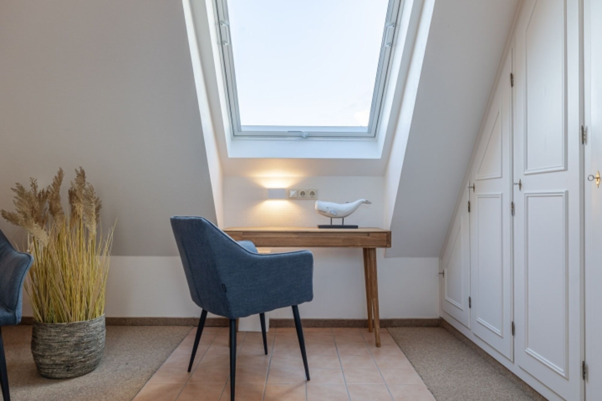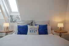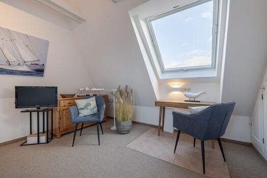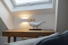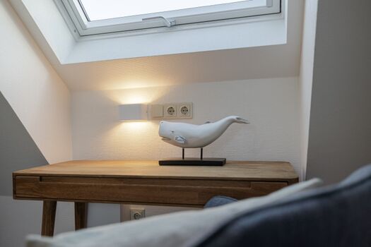 Unter dem Dach eröffnet sich ein weiterer, lichtdurchfluteter Rückzugsort: ein Schlafzimmer mit charmanten Schrägen, ebenfalls mit einem 160x200 cm Bett, viel Stauraum und einem kleinen Arbeitsplatz direkt am Dachfenster, der den Blick in den Himmel freigibt. Ein eigenes Badezimmer mit Badewanne verleiht diesem Bereich eine wohltuend private Note.