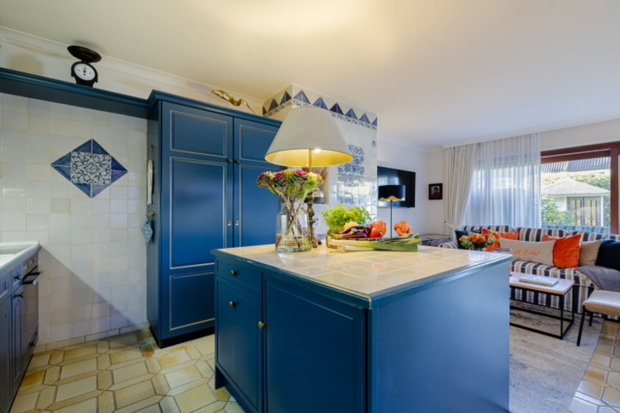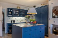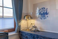 Die wunderschöne Landhausküche in Ozeanblau, die gemütliche Sofaecke und die warmen Farben schaffen innen ein Gefühl von Geborgenheit. Der Kamin ist dekorativ, zaubert aber mit seinen Kerzenlichtern eine stimmungsvolle Atmosphäre – besonders an kühleren Tagen. Auf dieser Ebene befinden sich zudem ein Vollbad sowie ein praktischer Waschraum, ideal für längere Aufenthalte, Strandtage und Reisen mit Kindern oder Hund.