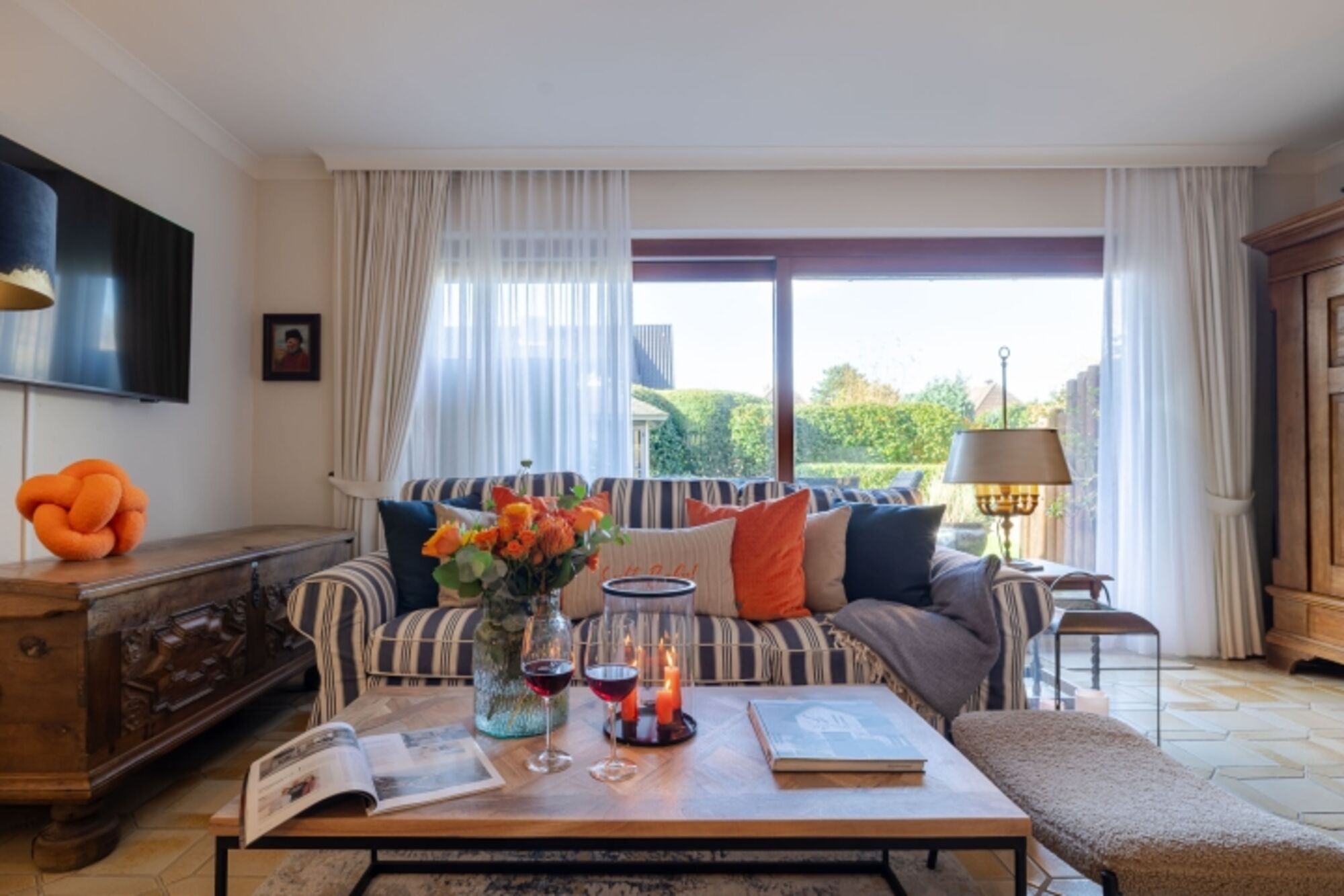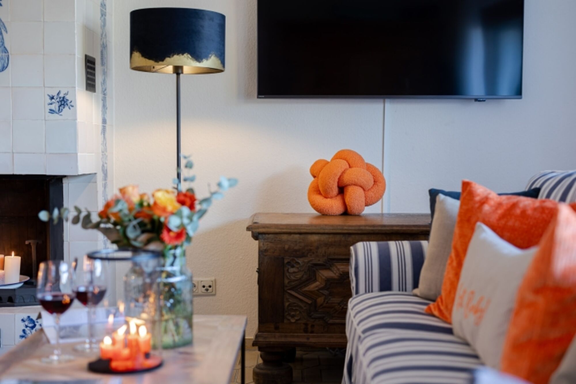 TV, TV-Kabel, TV-Flachbildschirm, Offener Kamin, Kaminofen, 3er-Sofa, Sessel