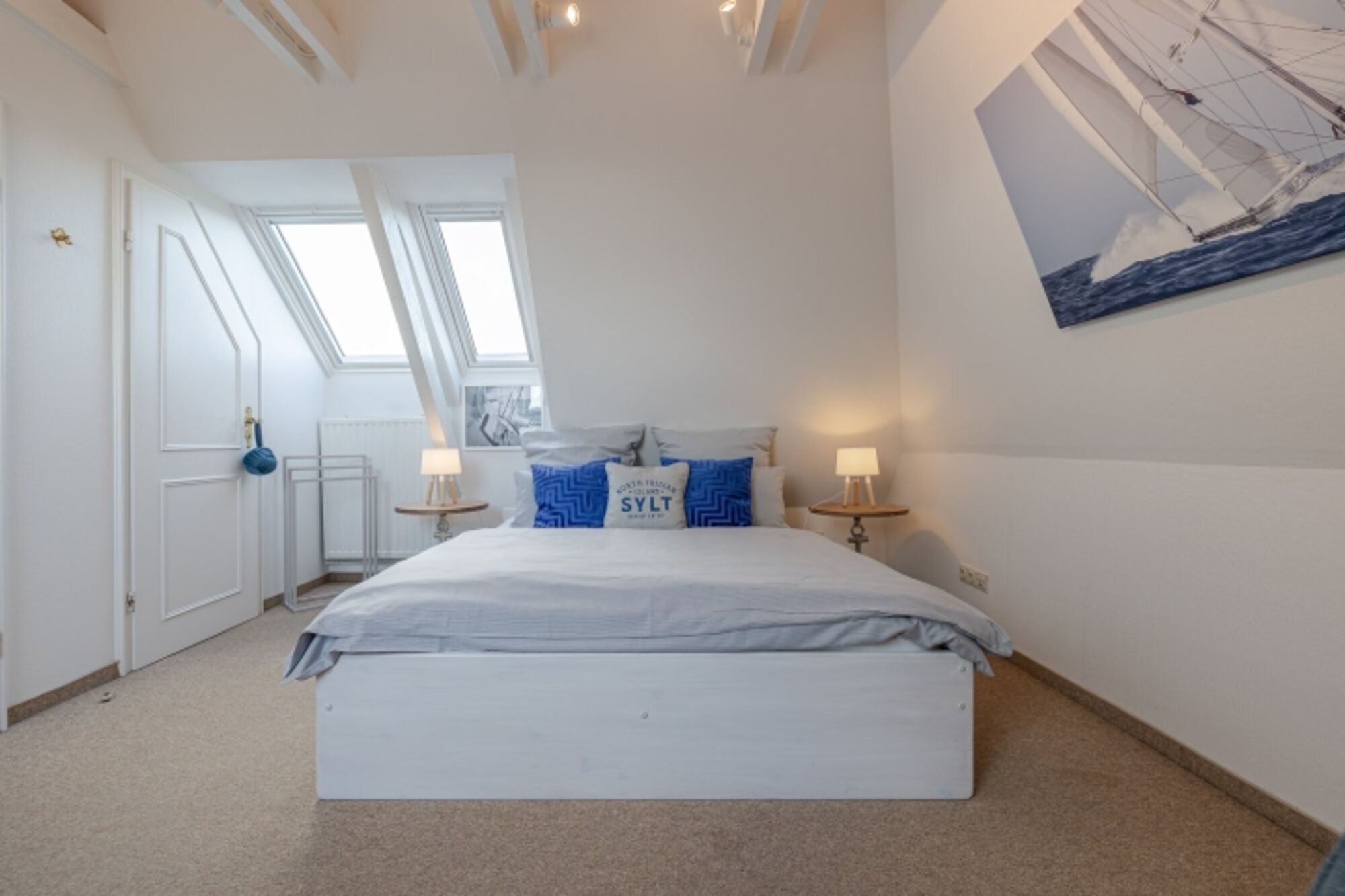 Auf der oberen Etage liegen die Schlafräume, die mit viel Liebe zum Detail gestaltet wurden. Das großzügige Hauptschlafzimmer überzeugt mit seiner freundlichen Ausstrahlung, viel Platz und einem komfortablen Boxspringbett in 180x200 cm, das für erholsame Nächte sorgt. Gleich daneben befindet sich ein kleineres, besonders gemütliches Schlafzimmer mit einem 160x200 cm Bett, maritimen Akzenten und warmen Stoffen – perfekt für Paare, Freunde oder ältere Kinder.