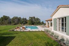 Ferienhaus mit Pool und umgeben von viel Grün