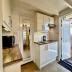 Das Badezimmer befindet sich im Erdgeschoss und verfügt über eine Dusche, ein WC und ein Waschbecken. Über eine Leiter gelangst du zur offenen Schlafempore, wo zwei Einzelbetten auf dich warten. Bei Ankunft sind die Betten bereits frisch bezogen. Handtücher kannst du bei der Buchung ganz einfach dazubuchen.