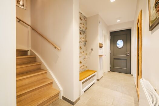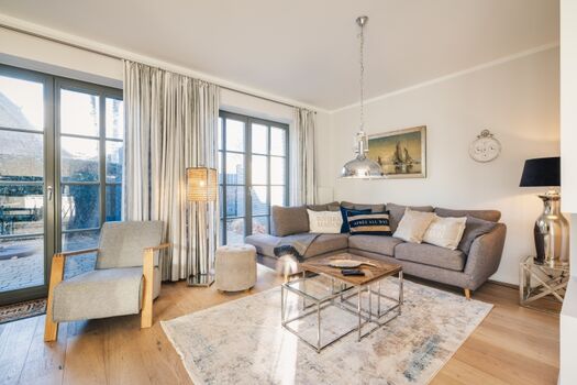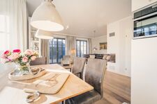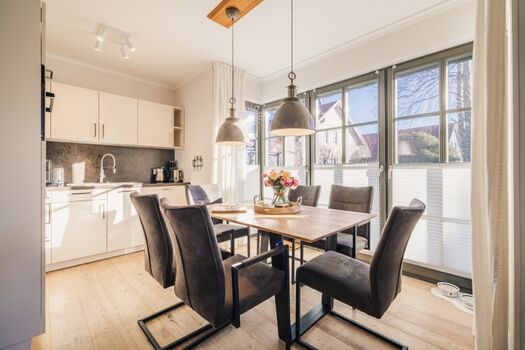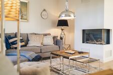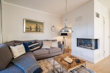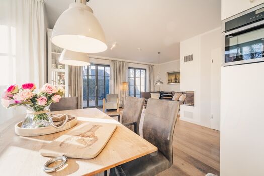 Der offene Wohn- und Essbereich im Erdgeschoss ist das Herzstück des Hauses. Große Fensterfronten sorgen für viel Licht, während der gemütliche Gaskamin in der Nebensaison für eine behagliche Stimmung sorgt. Die Einrichtung in warmen Farben unterstreicht den exklusiven Charakter dieses Ferienhauses an der Ostsee.