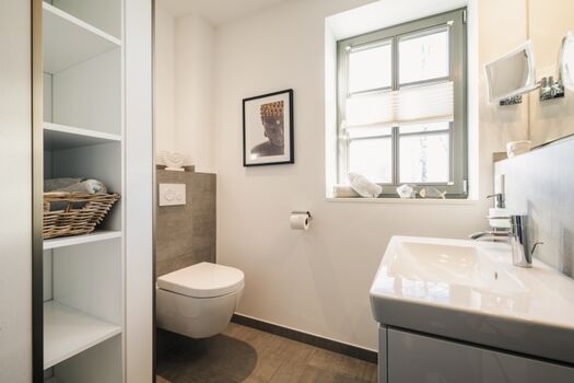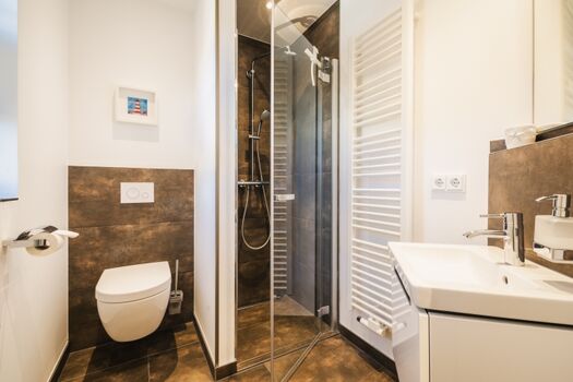 Badezimmer: Zwei moderne Badezimmer (eines im EG, eines im 1. OG), jeweils ausgestattet mit einer ebenerdigen Dusche.