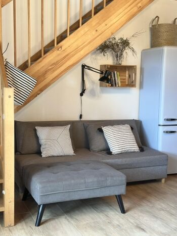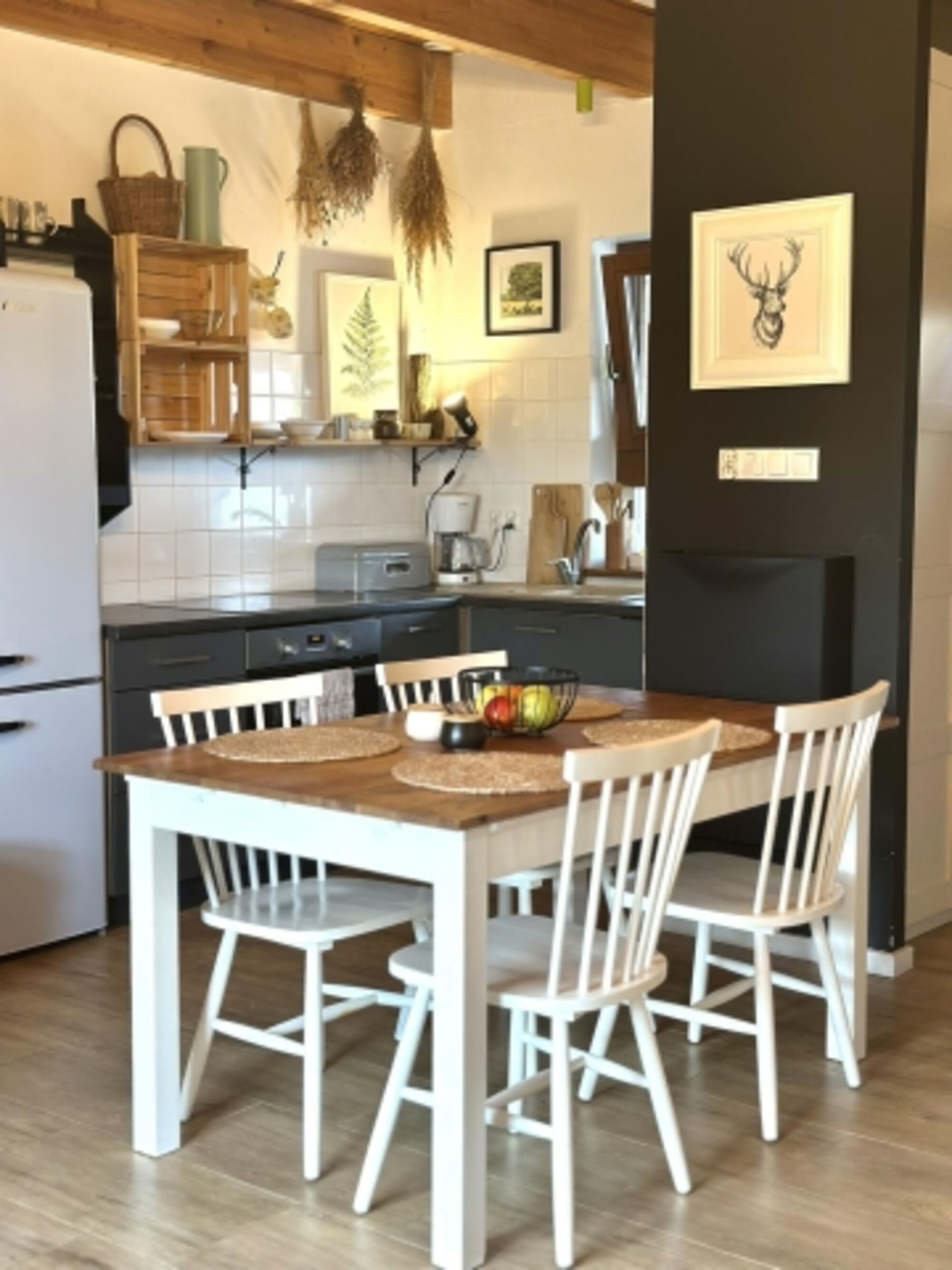 Domek wygodnie mieści 4 osoby (maksymalnie 5 osób). Na parterze znajduje się łazienka z prysznicem i toaletą, na piętrze dodatkowa toaleta.