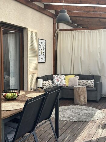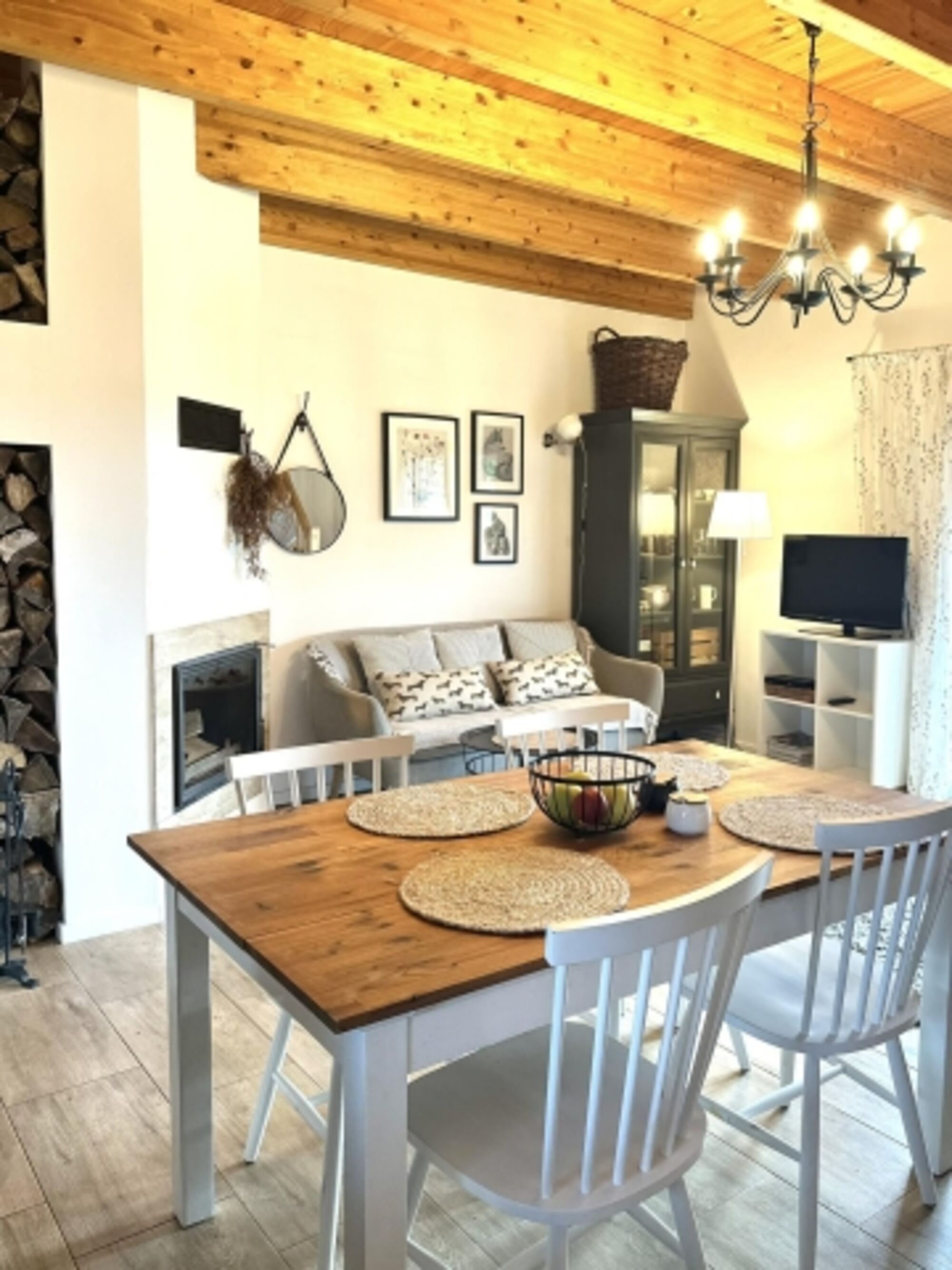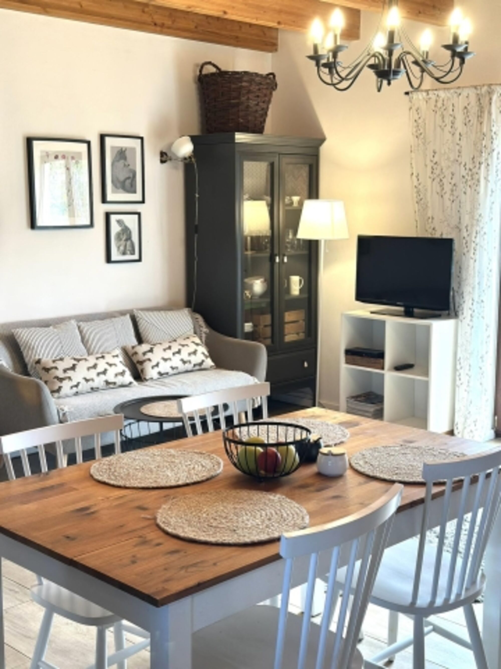 Domek wyposażony jest we wszystkie niezbędne akcesoria, takie jak talerze, garnki, pościel i ręczniki. Jest też pralka, zmywarka, telewizor i dostęp do internetu.