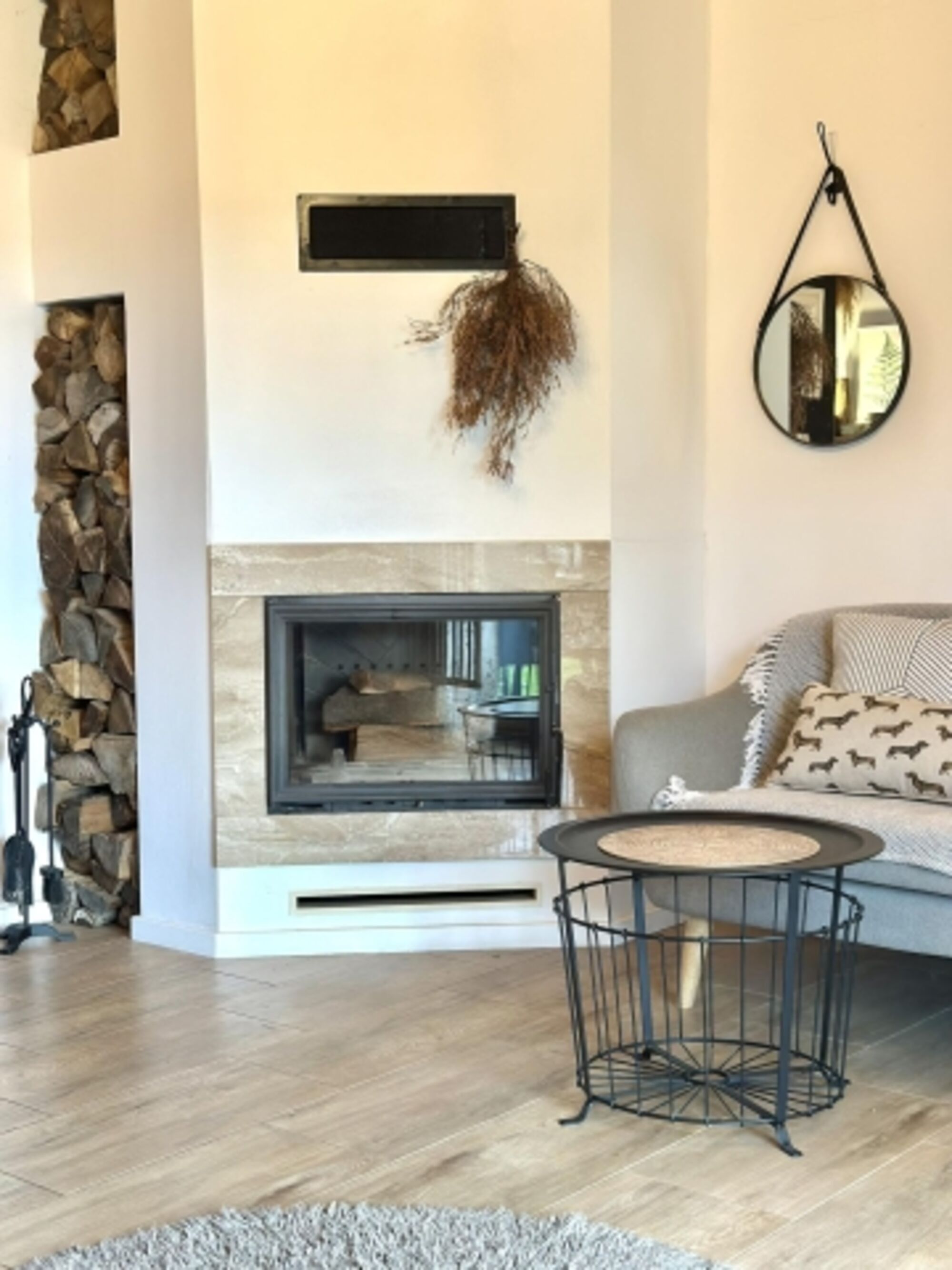 Na powierzchni 55 m² znajduje się salon z aneksem kuchennym i kominkiem, na piętrze są 2 pokoje.