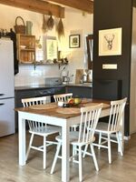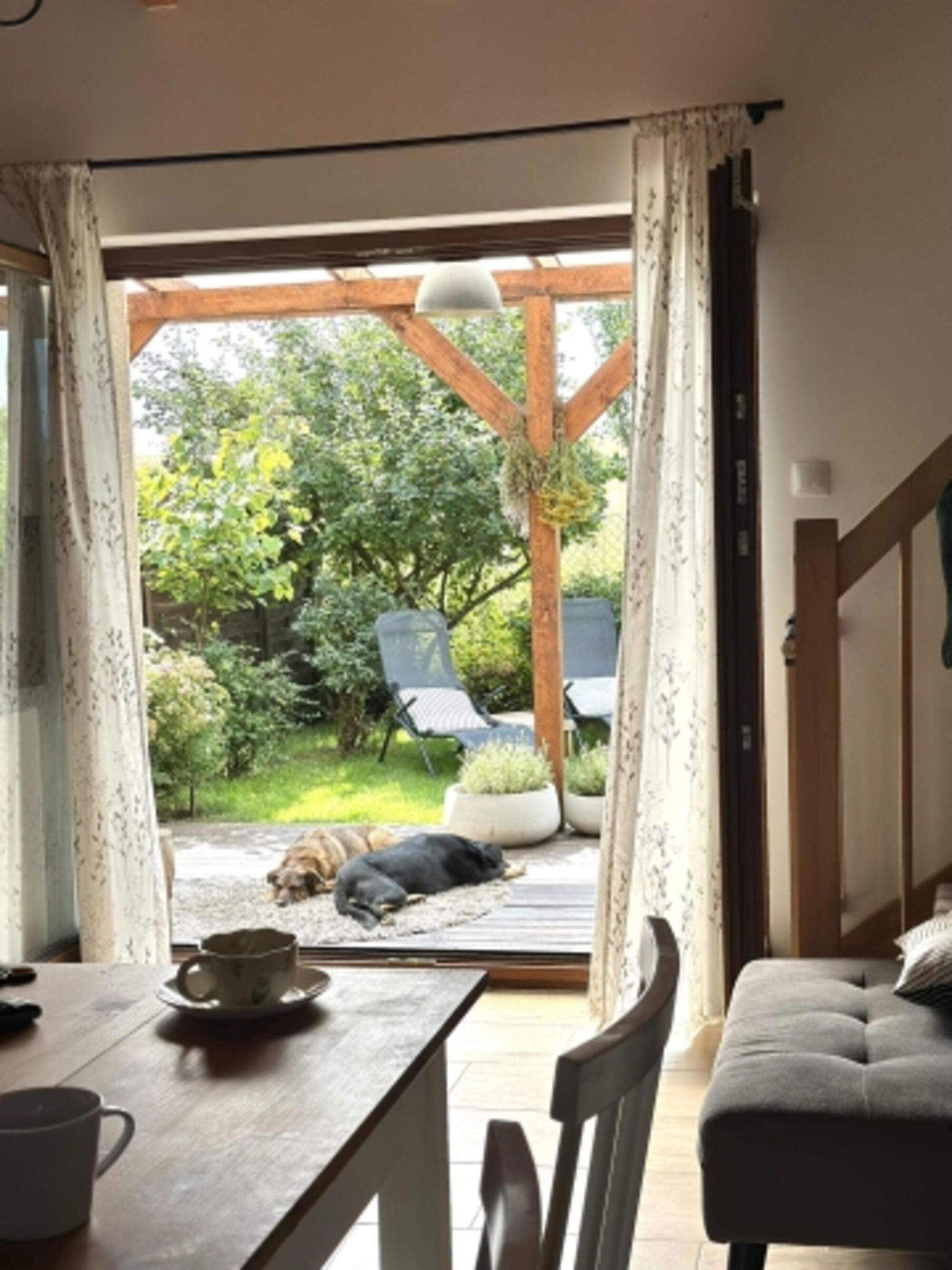 Dla psów mamy miski, worki na psie odchody i koce, żeby przykryć sofy. Domek to bliźniaczy dom. Ogród jest przeznaczony wyłącznie dla naszych gości i od przodu graniczy z polem, na którym można zobaczyć jelenie, lisy i dzikie ptaki (a także konie sąsiada).