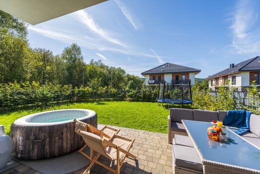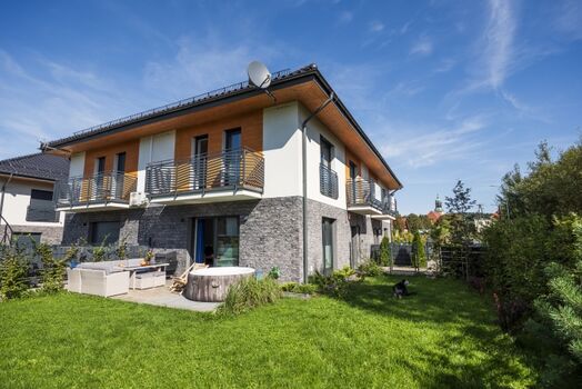 Unseren vierbeinigen Gästen bieten wir einen komplett eigezäunten Garten zum Austoben. Und für die mitreisenden Menschen steht ein beheiztes Whirlpool (verfügbar von Juni bis Ende September), Grill und bequemes Rattan Gartenmöbel-Set zur Verfügung. Alles für exqlusive Benutzung! Das Apartament eignet sich sehr gut für zwei Familien oder Gruppen bis zur 8-10 Personen (4 getrennte Schlafzimmer).