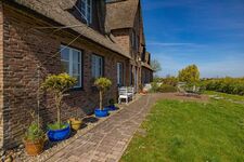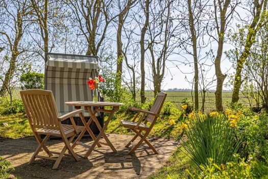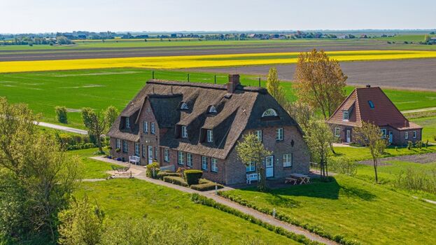 Weit, weiter, Warft – das beschreibt den Außenbereich ziemlich gut. Der Friesenhof liegt nicht nur verkehrsberuhigt und etwas abseits, umgeben von Feldern und Wiesen, sondern auch auf einem 4.000 qm großen Grundstück. Die Lage ist wie gemacht für Radwanderungen, deshalb gibt es neben dem PKW-Stellplatz einen Schuppen für Ihren Drahtesel.