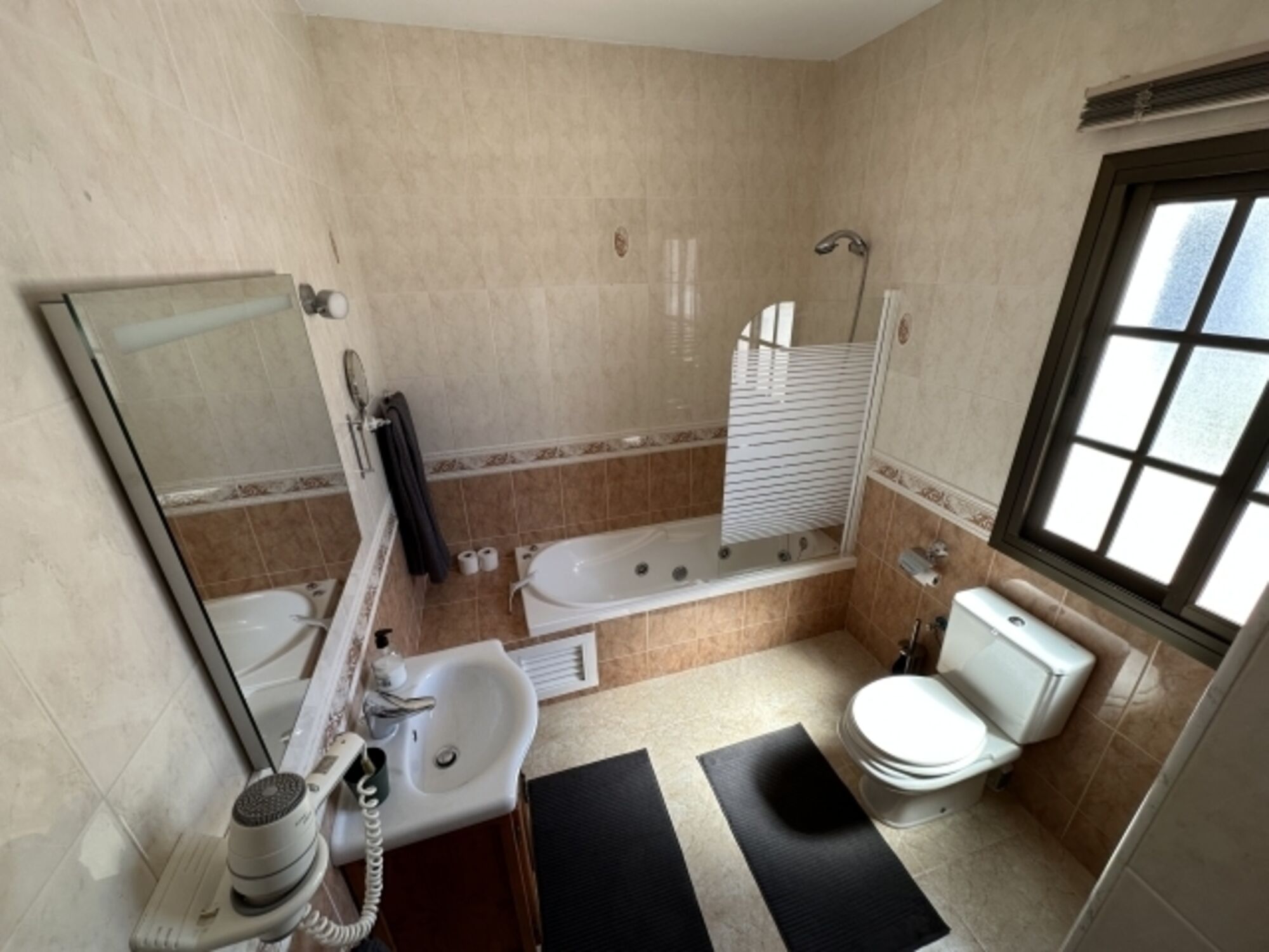 Waschbecken, Spiegel, Fenster im Bad, Fliegengitter