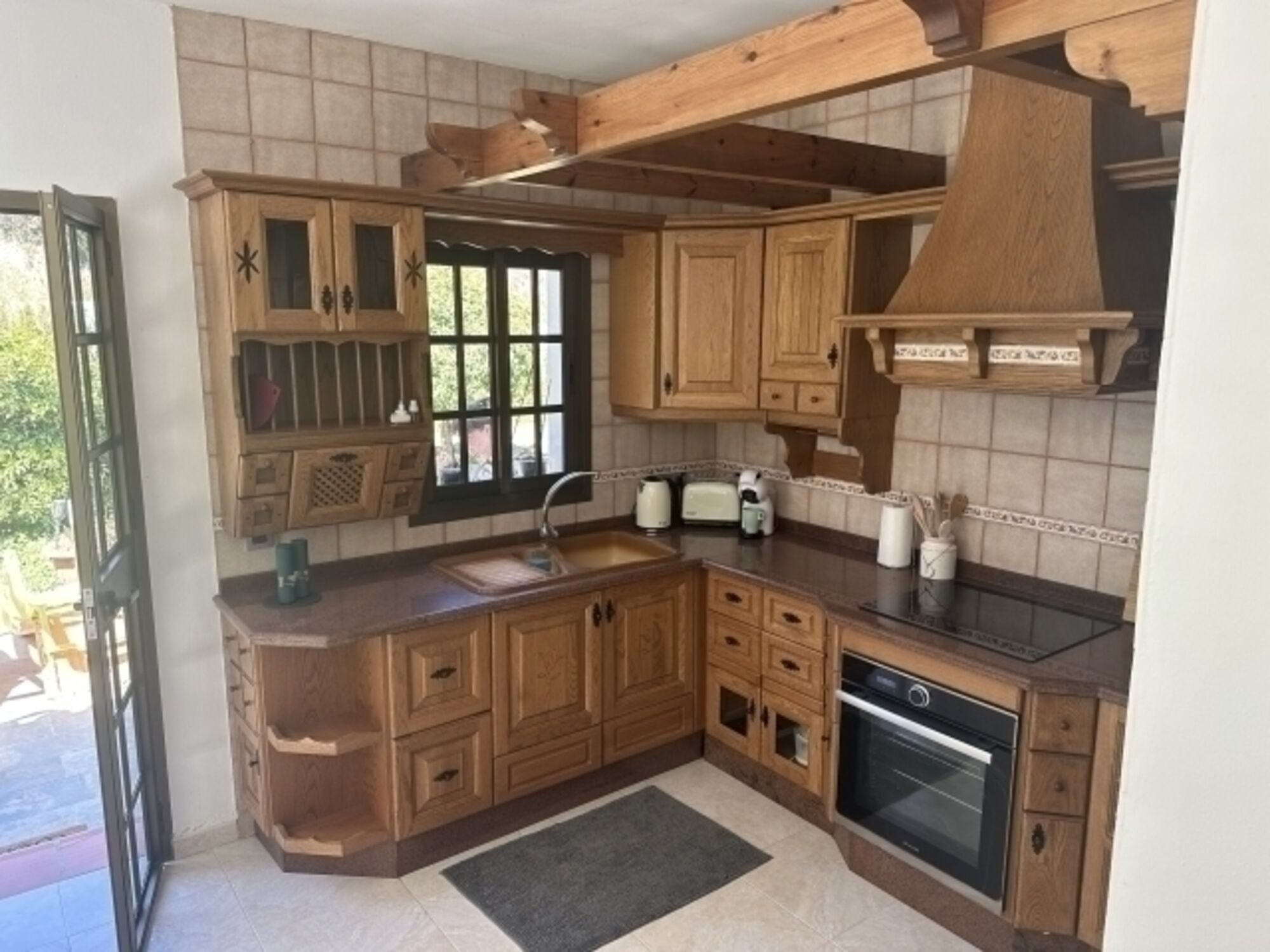 Induktionsherd, Dunstabzugshaube, Kühlschrank mit Gefrierfach, Mixer, Elekt. Fruchtpresse, Korkenzieher / Flaschenöffner, Gewürze (Salz, Pfeffer, Zucker), Öl / Essig, Geschirrhandtücher, Mülltüten, Essplatz in der Küche